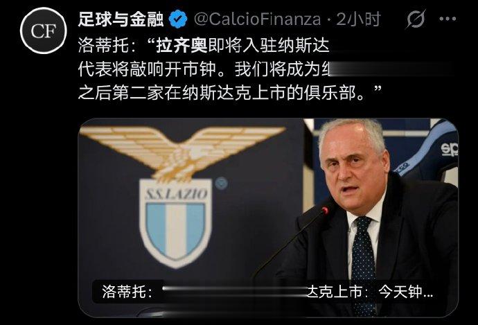 今晚恩里科·洛蒂托将到纳斯达克敲钟。有媒体解读为拉齐奥今天将在纳斯达克上市,不过根据了解,今天在纳斯达克上市的并没有拉齐奥。恩里科只是象征性的去敲开市钟。#拉齐奥[超话]#