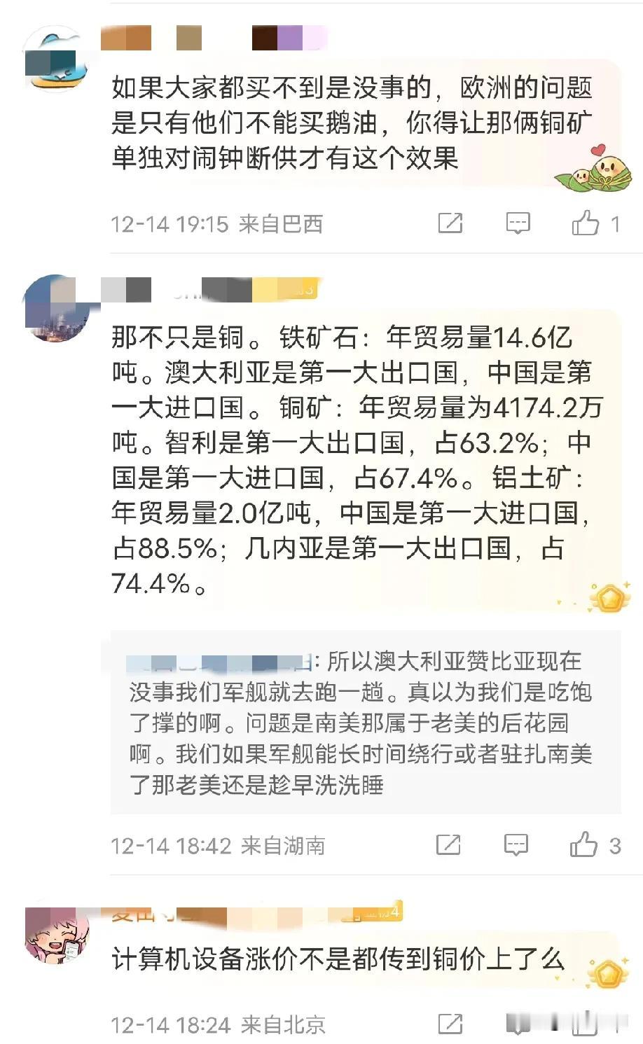 原来秘鲁和智利的铜出口占到世界的50%,难怪美国要重新在南美洲立威,南美洲资源太多了,美国肯定要控制的,而且又离美国那么近,美国一直把拉美当做自己的后花园,不允许别人染指,而且现在又开发了这么多资源出来,而且很多都是卖到我们这边来的,美国这次搞委内瑞拉,明显也是因为我们这两年派人帮助委内瑞拉开发石油了,因为委内瑞拉石油储量世界第一,但是杂质多,油的品位不高,所以成本高,利润低,我们人过去应该是要帮委内瑞拉把开采石油的成本降下来,美国立马就开始找事了!