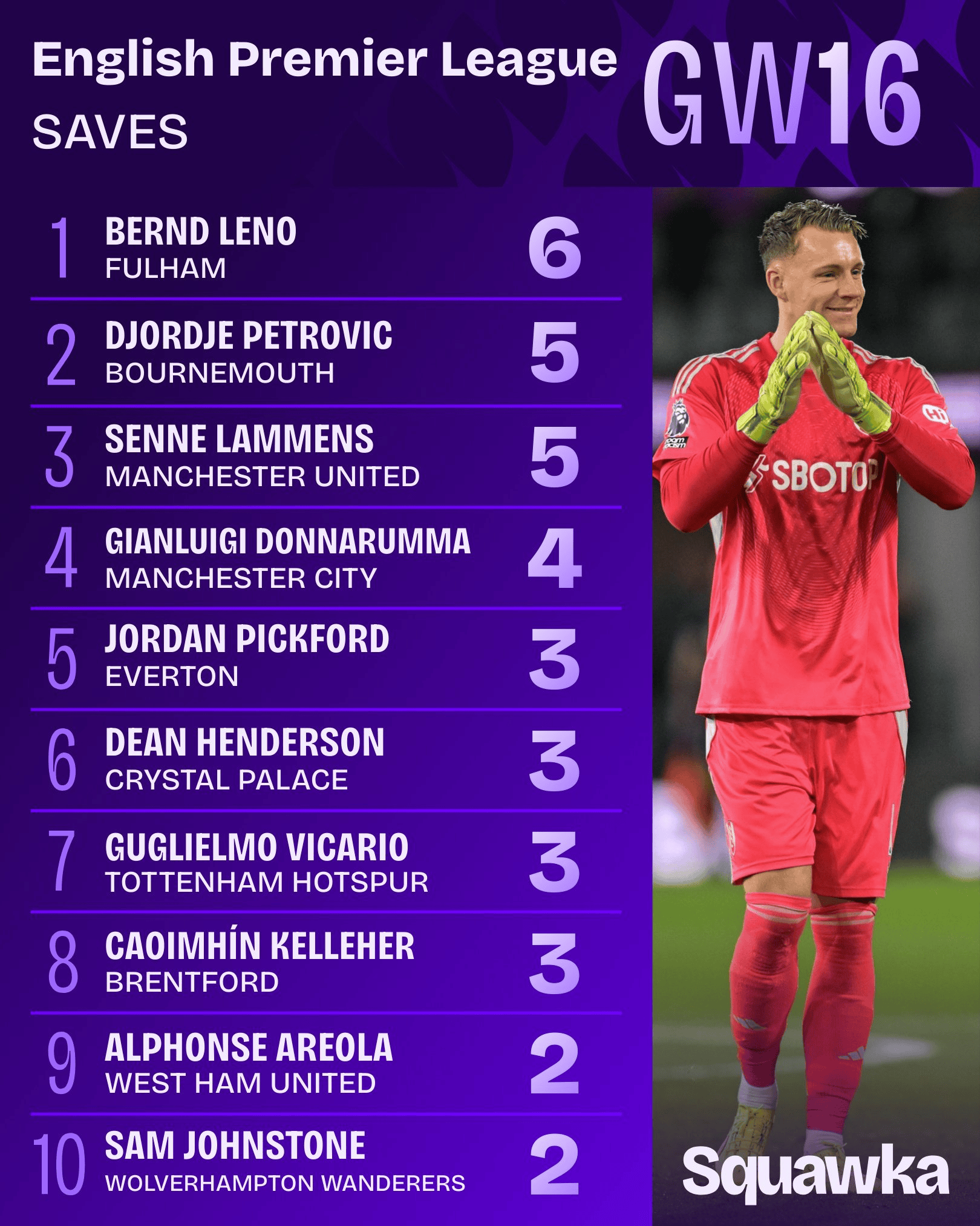 虎扑12月17日讯英超第16轮的比赛结束。数据网站squawka发布榜单,统计本轮英超扑救榜。