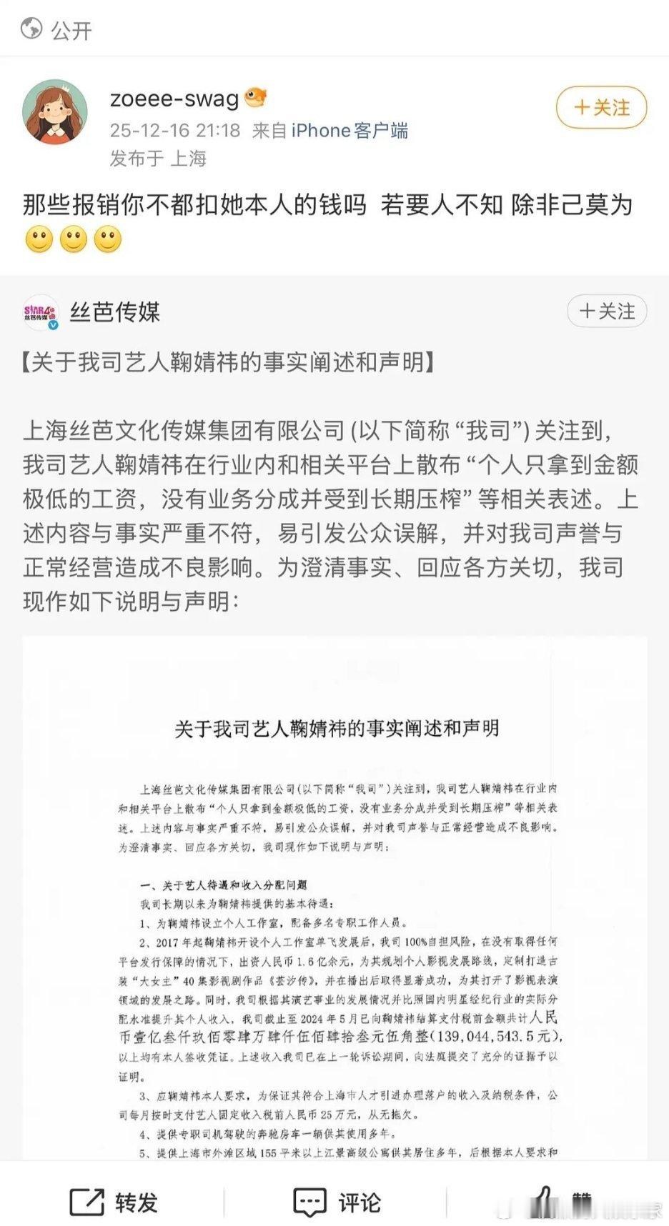 明星是高收入群体,但这也不是丝芭搞阴.阳合同隐瞒艺人真实收入的理由。况且这些收入本就是鞠婧祎该得的,网.红一场收入还几十万几百万了,公司靠着鞠婧祎赚了多少钱,怎么不说出来呢?鞠婧祎方代.理律师已回应,鉴.定的笔迹交给法.院了,不是她签的,和丝芭私下的鉴.定结果不一样,这个公司长期存在双.面合同,不按分.成给艺人。现在重点应该是公司违.约克.扣工资吧,感觉丝芭是想利用大众仇.富心理搞舆.论.战,模糊重点……鞠婧祎收入鞠婧祎方艾特丝芭