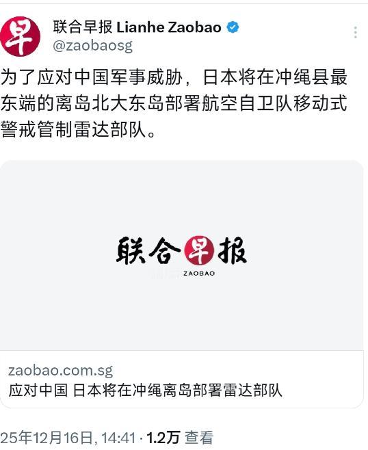 新加坡联合早报12月16日报道:“为了应对中国军事威胁,日本将在冲绳县最东端的离岛北大东岛部署航空自卫队移动式警戒管制雷达部队。” 新加坡联合早报12月16日的消息刚出来,不少人都在问日本要在北大东岛装雷达这事儿到底是真是假。 其实这事已经落定,12月15号,日本防卫省刚和冲绳县北大东村签了土地租赁合同,就等着2026年新年后开工了。 这次租的地在岛的东北部和南部,一共11公顷,计划盖部队宿舍,再装上车载式的警戒管制雷达,到时候会派30人左右的分队驻守。 可能有人没听过北大东岛,这岛就11.9平方公里大,离冲绳本岛得有360公里,岛上五百多人主要靠种甘蔗、捕鱼过日子,本来是个挺清静的地方。 但它的位置太关键了,正好卡在冲绳本岛和宫古岛之间,而宫古海峡是咱们海军舰队去太平洋训练的必经之路,航母编队经常从这儿过。 说白了这雷达就是个“谍眼”,总台军事观察员魏东旭都分析了,它能盯着周边的飞机、军舰动向,探测距离能到460多公里,不管天气咋样都能工作,比之前靠侦察机靠谱多了。 这可不是日本第一次在西南诸岛搞动作,之前久米岛有能探400公里的雷达,宫古岛装了专门盯隐身飞机的型号,现在加个北大东岛,等于把监控网补得更密了。 更值得注意的是,日本之前还给菲律宾送了同款雷达,两边能连起来用,监控范围直接延伸了。 岛上民众早就担心了,去年防卫省一说要装雷达,大家就怕这是个开头,以后说不定还要来部署导弹。 本来靠农业渔业吃饭,要是军事基地多了,不仅生活环境变了,游客说不定也不敢来了,旅游业者都喊着快到“存亡危机”了。 有人说战时把这雷达炸了不就行? 可问题是平时它一直在那儿转,咱们的训练规律、装备参数都可能被摸清楚,这种隐性的危害比战时的威胁更棘手。 而且这事儿也能看出,日本早就不是“专守防卫”了,西南诸岛都快被打造成一个完整的军事基地体系了。 现在就等着看明年开工后局势咋发展,毕竟这雷达对着的是咱们的出海通道,后续动向确实得盯着。 以上都是个人观点,对此您有什么不同的看法,可以在评论区留言讨论!!!