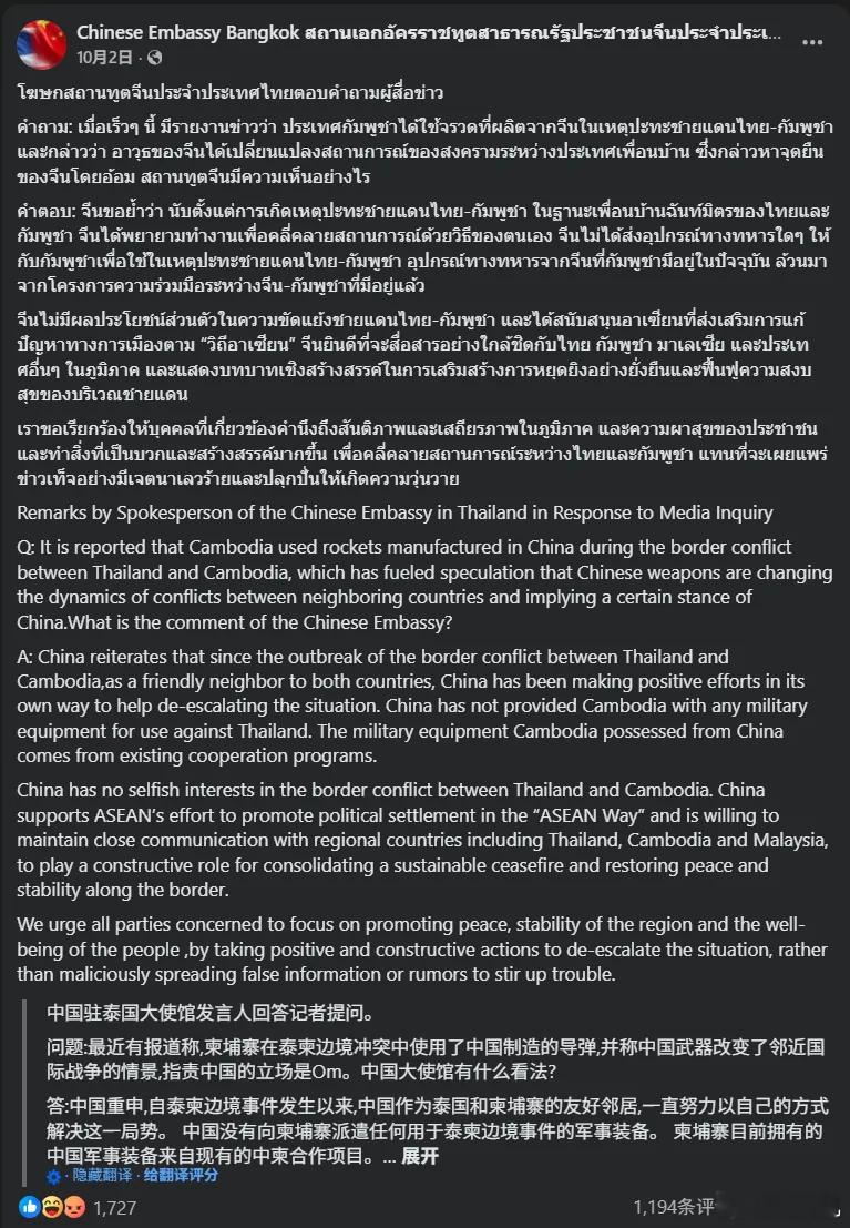 中方回应泰军在柬军阵地缴获中国装备 12月17日,郭嘉昆回应泰国在柬埔寨缴获中国装备:中国与泰国柬埔寨以往都开展了正常的防务合作,不针对第三方,更与柬泰边境冲突无关。