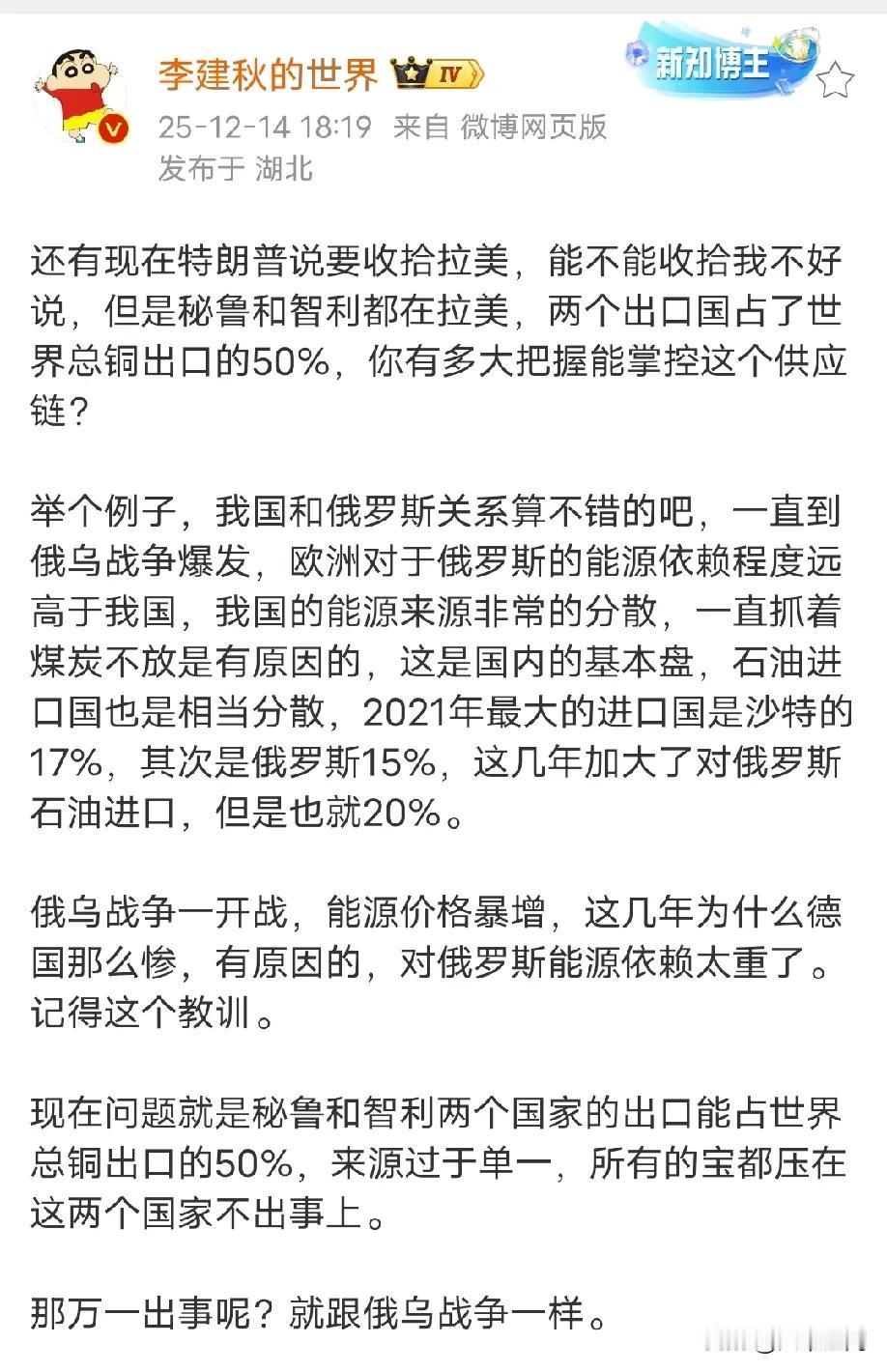 难怪川普要敲打委内瑞拉,这是在震慑整个南美,第一跳出来讨好的美国的南美国内出现了,玻利维亚的新任总统要中止和中国俄罗斯的锂矿开采的合作,转而跟美国合作,玻利维亚拥有世界上最大的锂矿储量,但是产量很低,因为开采技术和基础设施落后! 其实整个南美的矿产资源非常丰富的,比如智利和秘鲁的精铜矿出口就占了世界的50%,还有白银,铁矿石储量都非常丰富,别忘了委内瑞拉的石油储量是世界第一,只是开采成本比较高而已,所以美国不会无缘无故去搞委内瑞拉了,实际上就是在控制南美的资源!我们迫切需要核动力航母,建立真正的远洋舰队,然后没事多去南美溜达!