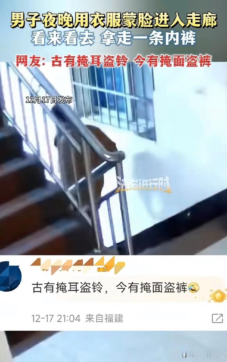 “防不胜防了!”年轻男子夜晚用衣服蒙脸进入走廊,看来看去后,拿走一条内裤,网友辣评:古有掩耳盗铃,今有掩面盗裤。 万万没想到,这些趁着月黑风高作案的小偷,不偷金和银,只偷走条内裤,真让人防不胜防啊! 12月17日,有网友曝料,自己走廊上晒的内裤离奇失踪。 查看监控后,让网友啼笑皆非的“盗窃案”当场曝光。 据视频显示时间是晚上,该男子打扮时尚,戴着运动手表,穿着年轻姜黄色的冲锋衣。 怕被走廊上的监控抓拍到,男子拿右手扯起衣领,挡住了整个脸。 随后,他一步一步朝着走廊上走去,在一堆袜子和内裤中看来看去的,锁定了一条白色内裤。 得手后,他毫不拖沓,匆匆下楼溜之大吉,整个作案过程干净利落,没有半分的犹豫。 这段监控一经曝光,瞬间逗乐了屏幕前的网友。 有网友调侃:“古有掩耳盗铃,今有掩面盗裤,这届小偷的迷惑行为真是开了眼!” “偷啥不好偷内裤,这品味和脑回路,实在让人捉摸不透。” 如此奇葩的盗窃行径,也算是给大家提了个醒。 以后晾晒衣物,不仅要防风吹雨淋,还得防着这种“口味独特”的小偷! 消息来源于《法治进行时》