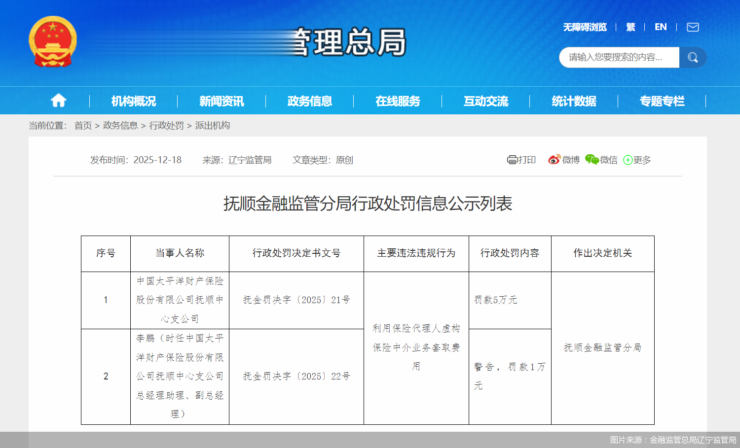 北京商报讯(记者李秀梅)12月18日,金融监管总局辽宁监管局发布行政处罚信息显示,中国太平洋财产保险股份有限公司抚顺中心支公司,因利用保险代理人虚构保险中介业务套取费用,被罚款5万元。时任中国太平洋财产保险股份有限公司抚顺中心支公司总经理助理、副总经理李鹏被警告并罚款1万元。