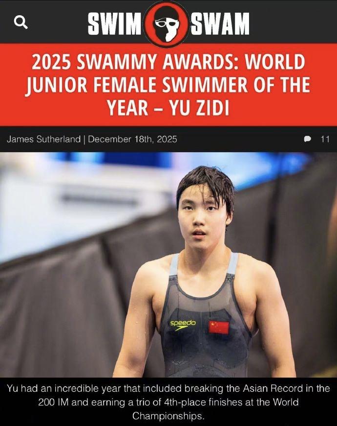 虎扑12月19日讯知名游泳媒体SwimSwam公布2025各奖项名单,中国13岁小将于子迪当选年度最佳女子青年游泳运动员。