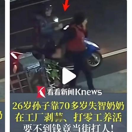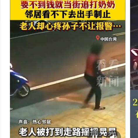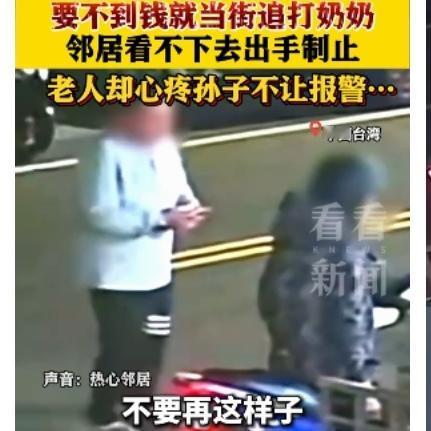 痛心!26岁孙子当街殴打失智奶奶 只因要钱上网被拒 台湾彰化县街头发生的一幕,看得人怒火中烧。26岁的无业男子林某,向75岁的失智奶奶伸手要钱,想拿去上网,被拒绝后竟然当场施暴。 监控里的画面让人揪心,刚从剥蒜工厂下班的陈奶奶,被孙子揪住头发拖拽,摔倒在地后还被抬脚踹踢,甚至遭到安全帽猛撞额头。要知道,这位老人十多年来靠着剥蒜的微薄收入,一手养大了父亲早逝、母亲离家的孙子,哪怕患上失智症,也总想着预支工资满足孙子的要求。 邻居听到动静赶来呵斥制止,可让人五味杂陈的是,陈奶奶还护着孙子,拦着不让报警,嘴里念叨着“他不是坏孩子”。工厂员工透露,林某早就把奶奶当成了摇钱树,隔三差五就来要钱,不给就吵闹动手,老人经常一边剥蒜一边偷偷抹泪。 目前警方已经介入,将以家暴、伤害直系血亲尊亲属罪进行侦办,相关部门也已介入为老人提供生活协助。 溺爱不是疼爱,过度纵容只会养出“白眼狼”。你觉得该如何杜绝这类因溺爱引发的家庭悲剧?评论区说说你的看法。