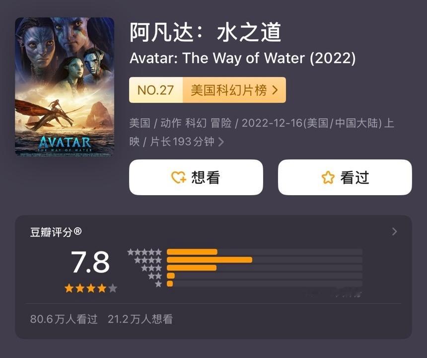 《阿凡达3》豆瓣开分7.6,三部最低评分。你看了吗?打几分?