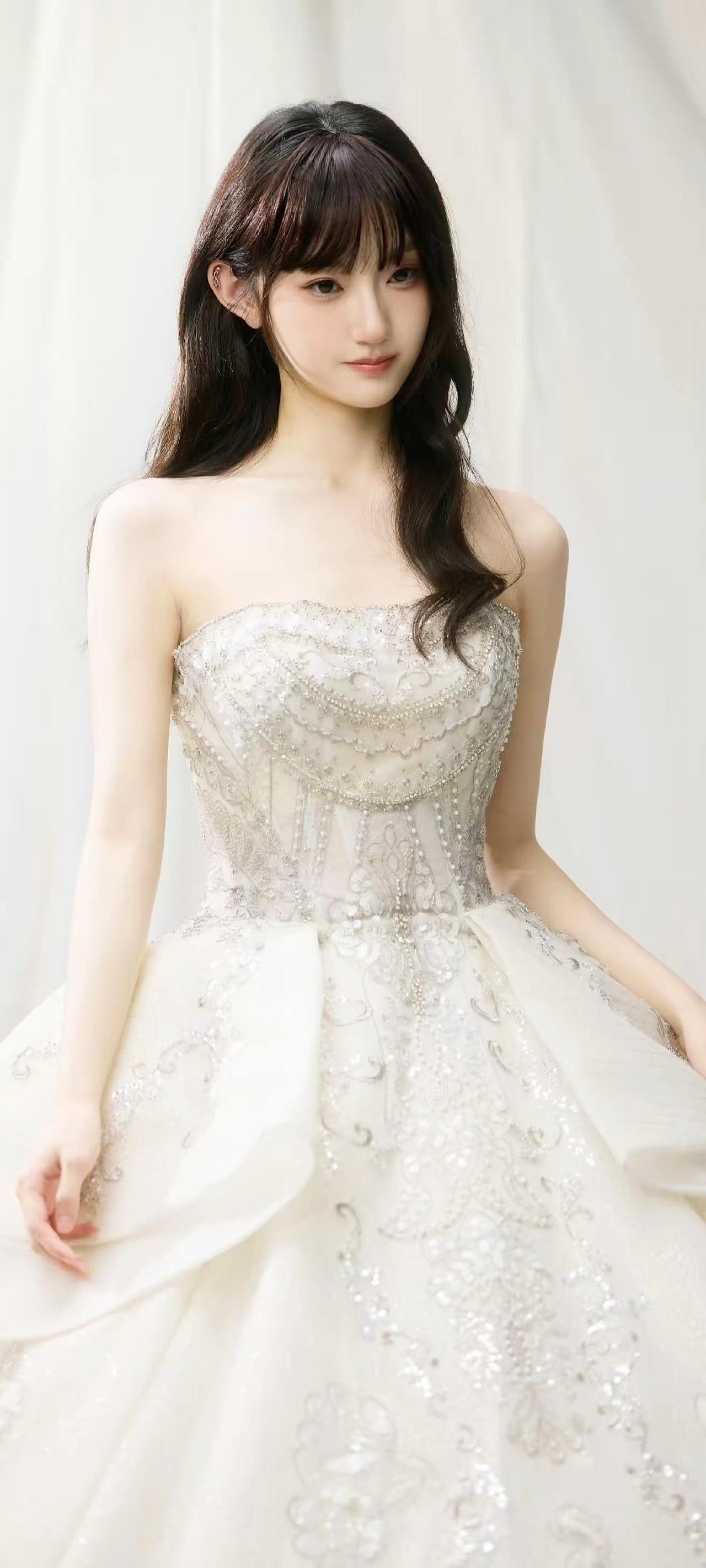 《白纱凝光》原创诗词 原创看图片配诗 珠钻凝霜缀白纱,香肩微露衬娇华。 鬓云轻