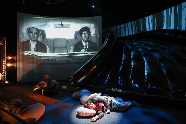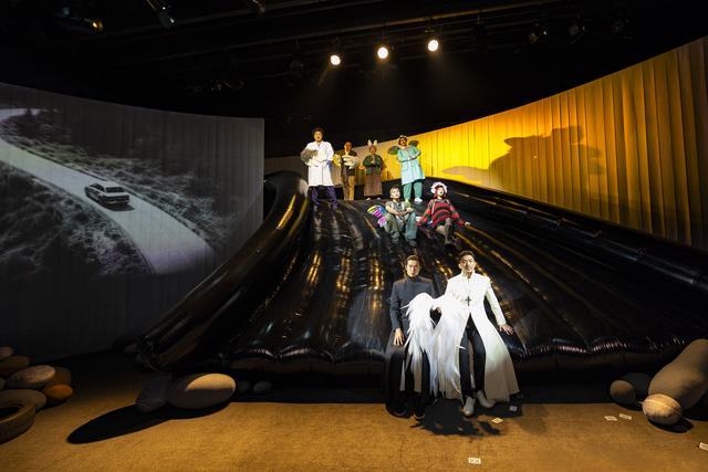 舞台上到处是散落的石块、歪掉的路牌,俨然是一场车祸现场,而占据视野的是高达3米的充气滑梯。导演林丛说,在这样巨型装置的笼罩下,台上发生的一切更增添了一份“纯属虚构”的抽象感和象征意味。