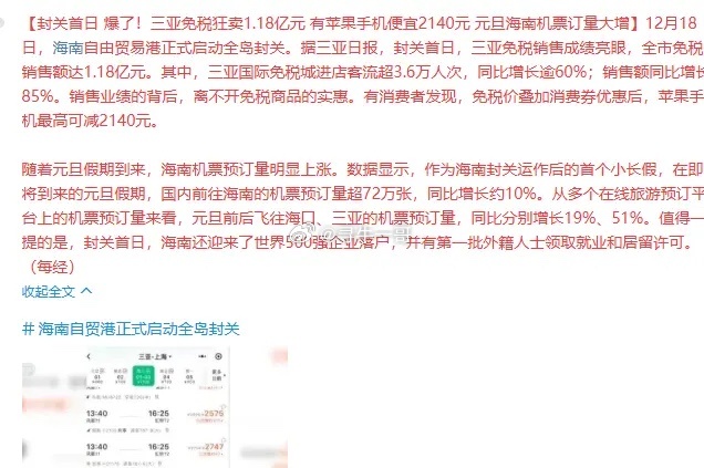 周末消息面,海南封关免税消息刷屏,周五海南板块大涨5.19%,全A地区行业板块第一,12月18日正式封关大跌,明显的弱转强。海南周五更多的是消费逻辑,免税逻辑,周末很明显,消费逻辑加强,下周市场延续预期,叠加元旦假期,旅游,消费,观察从福建板块出来的资金能否进入海南。周五尾盘,福建龙头集体直线跳水大跌,平潭发展,合富中国,东百集团,海峡创新等,炒地图的都是一类资金,之前福建,海南一直联动。下周重点观察,海南自贸板块。1.封关首日 爆了!三亚免税狂卖1.18亿元 有苹果手机便宜2140元 元旦海南机票订量大增2.海南封关120多万卡宴只卖60万 40克金饰能省1万多元!网友:已经在看机票了今日看盘a股财经