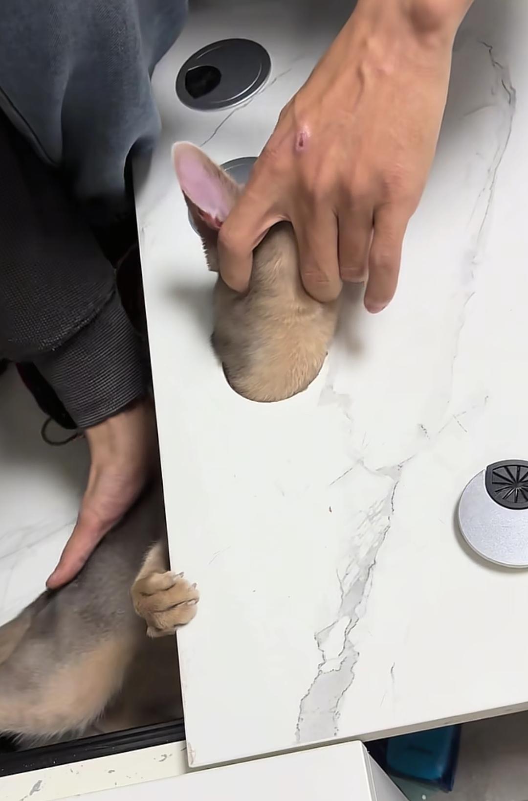 猫猫太淘气这可怎么办? 猫猫来到新书房,什么都好奇?这是瞧瞧,那里看看,不知什么时候跳进书桌里,把头钻进线孔里,退不回去,钻不出来,搞了半天都没成功,实在没办法叫来邻居帮忙,他说只有一个办法就是把书桌面锯开,但我又舍不得锯坏桌面,还有其它什么办法吗?着急,谢谢!!