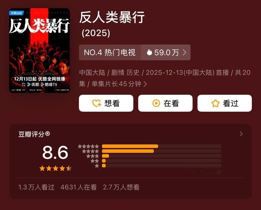 同样的故事背景,电影《731》至今未开分,电视剧《反人类暴行》目前8.6分。