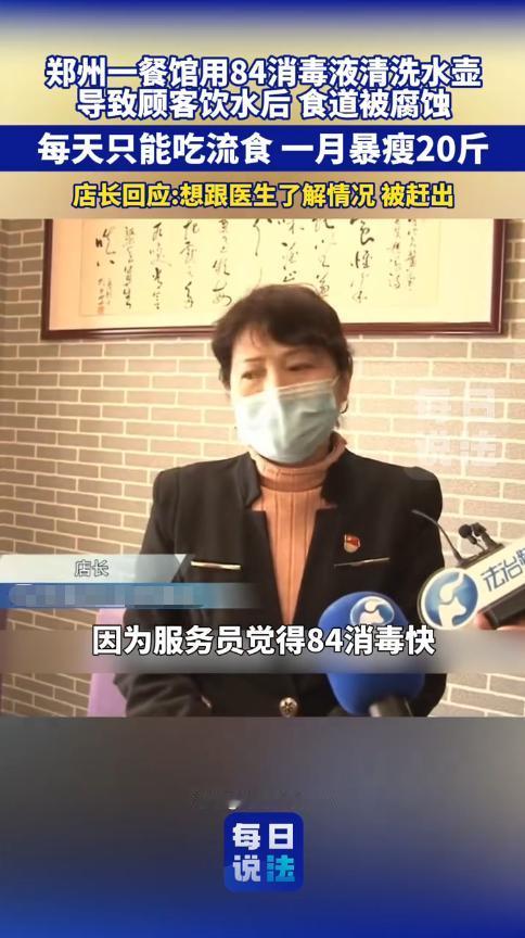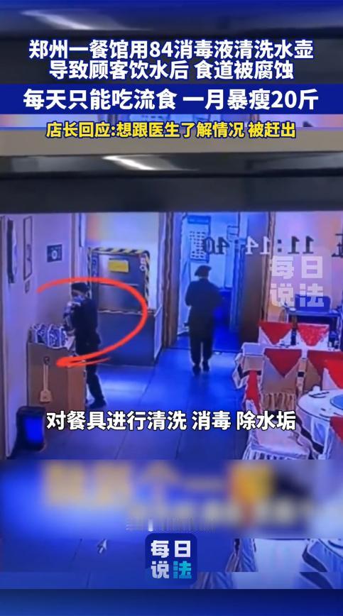 “必须严惩!”11月21日,河南郑州,一男子去饭店吃饭,尝了一口水,感觉味道比较酸,10分钟后,服务员匆忙跑了过来,换了个新的水壶。可到了下午,男子突然腹痛、恶心,询问后才知道,服务员用84消毒液清洗水壶!店长:一个小小的失误。 84消毒液很多家庭里面都有,用来清除难除的污渍非常方便,想必大家也知道,这玩意有毒,是不能食用的,所以平时一定要妥善保存,不能让孩子接触到。 当天中午,简先生和朋友们去饭店吃饭,由于一上午没怎么喝水,他先端起水杯喝了一口,可是却感觉味道有些不对,询问服务员,对方表示可能是泡了什么东西。 简先生觉得这也正常,就把一整杯水全喝了,可是10分钟后,一名服务员着急忙慌的跑了过来,给他们更换了新的水壶。 几人并没有在意,吃完饭后便回去继续工作了。可是到了下午,简先生的肚子却疼得厉害,而且嗓子也有灼烧感。 几个小时后,简先生的症状再度恶化,他详细询问了服务员,对方这才交代那个水壶里有84消毒液! 由于现在洗胃已经来不及了,简先生只能一点点的治疗,如今已经住了一个多月的院,整日只能吃流食,瘦了20多斤! 这件事希望能给所有餐饮行业的老板一个警示,食品安全是最重要的,岂能用打扫卫生的东西来清洁餐具?这完全是对顾客的不负责。 信息来源:《喝用84消毒液洗过的水壶倒的水,顾客住院爆瘦20斤 当事人:不理解为什么有人用84清洗餐具。》新快报