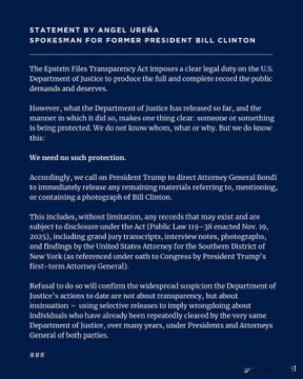 当地时间12月22日,美国前总统克林顿的办公室发言发表声明,呼吁美国司法部完全透明发布所有相关的爱泼斯坦文件,并批评司法部处理档案泄露的方式。 声明是这么写的:“司法部迄今为止公布的信息及其公布方式清楚地表明了一点:有人或某些事物正在受到保护。我们不知道是谁、是什么,也不知道为什么。但我们知道一点:我们不需要这种保护。” 司法部于12月19日部分发布爱泼斯坦文件,文件包含多张克林顿与爱泼斯坦及助手的照片,但有大量照片未完整发布,引发了包括克林顿办公室、国会议员和受害者在内的多方批评。克林顿办公室要求立即发布所有剩余相关材料,以避免“选择性发布”。 爱泼斯坦文件牵涉到太多人,可以说涉及美国各界名流。由于文件迟迟没有公布,再加上特朗普本身以及司法部对公布文件的态度前后不一,引发坊间强烈讨论和猜测。 到目前为止,有一点可以确认:就是爱泼斯坦文件是一枚威力巨大的炸弹,如果引爆了,不知道要炸死谁、炸死多少名流。