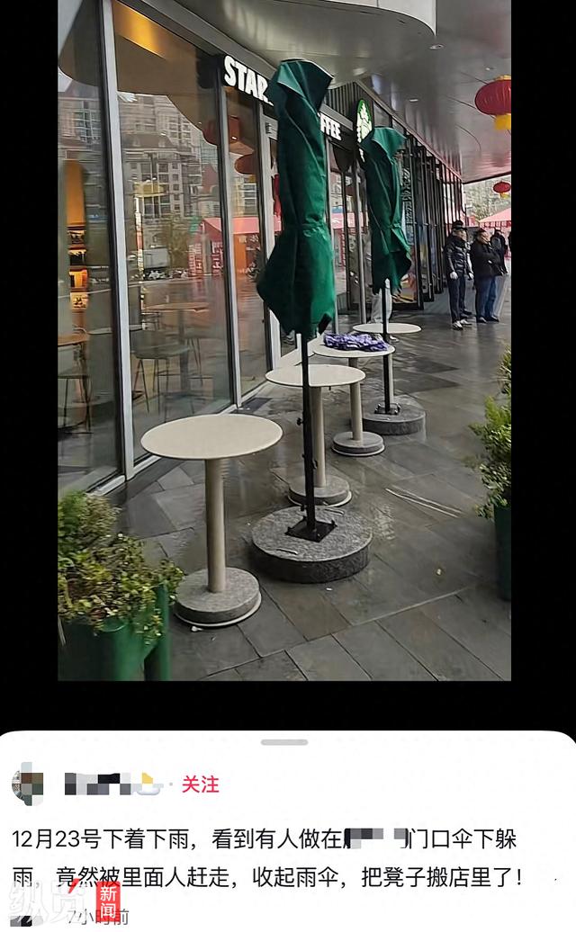 12月23日,有地址安徽的网友发视频称,今天(23日)早上,他和朋友在星巴克一家门店门前的大伞下躲雨时被赶走,工作人员将伞收起后,连椅子也搬回了店内,让他感觉很不舒服。12月23日,记者联系到涉事的星巴克门店,负责人拒绝了记者的采访。该星巴克门店所在商场了解情况后回复纵览新闻,店方解释,是因为遮阳伞吸水后有安全隐患,店员才将伞收起,提醒顾客不要在此避雨。