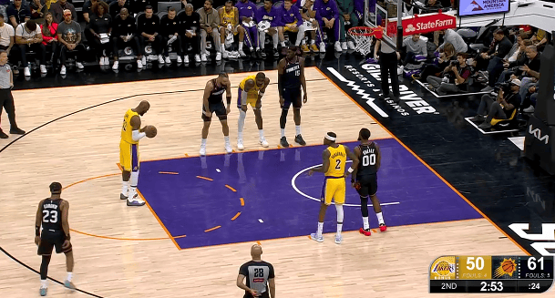 詹姆斯再造犯规又两罚一中,目前11罚6中、湖人全队19罚11中