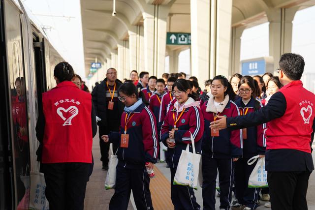 ▲12月7日,学生代表在铜川站登乘复兴号动车组列车。新华社发(刘翔摄)