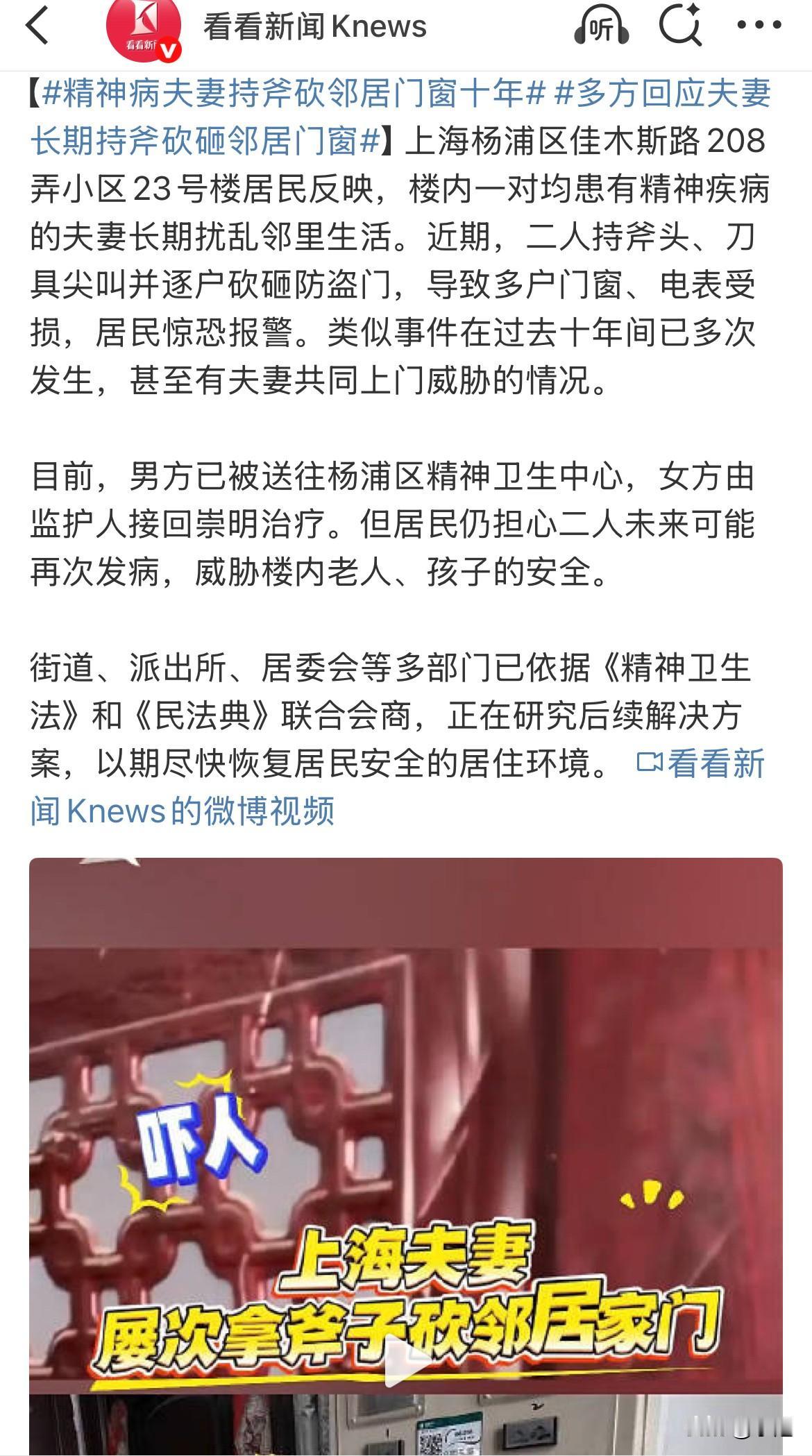 那天下午,那把斧头离小姑娘的头顶,只有几厘米。四年前,男人砍破邻居家的门冲进去,就这么把斧头压在一个小女孩的头上。这不是电影,是上海杨浦一栋老楼里,真实发生的、持续了十年的噩梦。 最近这次,噩梦又回来了。夫妻俩抄起斧头和刀,在楼道里边尖叫边往上冲。从一楼开始,“哐!哐!哐!”的砍砸声像放鞭炮一样炸开。防盗门被砍出白色的深痕,玻璃窗被砸得粉碎,碎片溅得到处都是。电表箱也被劈烂了,电线都露在外面。 三楼的一户人家,妈妈正带着女儿睡觉。听到楼下动静,她光脚下床,死死反锁两道门。刚拿起手机报警,斧头就砍在了自家门上,紧接着窗户玻璃爆裂。她捂住女儿的嘴,两人缩在门后的墙角,能清楚听到门外粗重的喘气声和吼叫。她们一动不动,连呼吸都停了,眼睁睁看着碎玻璃碴弹到脚边。 这栋楼的居民,对这种声音太熟悉了。几乎每扇门上,都留着或新或旧的砍痕。有一家的窗户,四年前被砸碎后,至今还钉着块发黑的木板。老邻居们说,最可怕的是“夫妻双打”——两个人一起上楼,又喊又叫,两把家伙同时砍在一扇门上。你知道外面是两个完全失控的人,除了反锁门报警,一点办法都没有。 十年下来,恐惧把整栋楼的生活习惯都改了。家家户户,白天在家也习惯性反锁门。晚上睡觉特别轻,楼道里有一点风吹草动,整个人会从床上弹起来,手已经摸到了手机。老人不敢单独下楼遛弯,孩子放学必须大人直接接进家门。有家长甚至教孩子,听到砍砸声,要立刻跑到最远的角落,用被子蒙住头。 每次闹完,会有一段可怕的风平浪静。男人通常被警察带走,可过一阵子,他又会回来。然后,在某个平常的下午,尖叫和砍砸声再次响起。这种循环,让居民觉得身边埋了颗不知道什么时候会炸的雷。 这次之后,男的被送到了杨浦区精神卫生中心,女的被崇明的家人接走。街道、派出所、居委会开了会,说在研究“后续方案”。 但会开完了,楼道里安静得可怕。那扇刚被砍坏的门还没修。居民们聚在一起,问的都是以后:“这次能治多久?”“要是回来了,再犯病怎么办?” 他们怕的,不是已经落下的斧头,是那把不知道什么时候、又会从谁家门前再次举起的斧头。他们等了十年,等的就是一个能让人摘下恐惧,踏踏实实睡到天亮的,普通的明天。