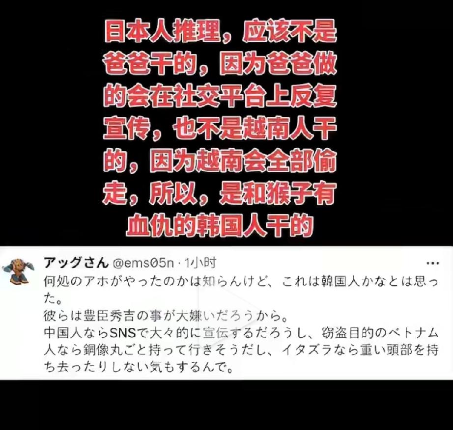 号称“岛国秦始皇”的丰臣秀吉雕像脑袋被扭断、踢飞案后续,两名嫌犯都是日本人,其中一人还是日本警察…此前日本网民怪了韩国人、中国人、越南人,当然,他们最怀疑是韩国人,但没想到…[泪奔][泪奔][泪奔] 据日本广播协会、名古屋电视台报道,爱知县名古屋市一座丰臣秀吉人物雕像今年8月被“斩首”,当地警方通过调查最后发现一名日本警察涉案。据悉警方是通过调查现场附近的监控录像等发现,涉嫌作案的是爱媛县一名男性警察和名古屋市西区一名男子。 8月19日晚该警察用手将雕像头部扭断,该雕像用增强塑料制成。名古屋市男子涉嫌8月23日凌晨“用脚将被扭断的头踢飞”。警方称两人并不认识,涉案警察是因出差来到爱知县,作案时该警察似乎处于醉酒状态。名古屋事件 日本偷历史 丰臣秀吉身高