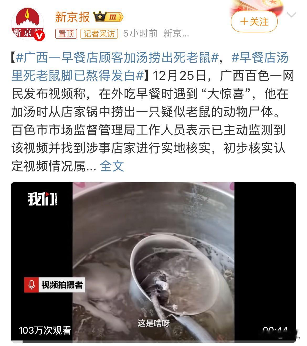 恶心!广西百色一家早餐店的顾客,手一抖,心都凉透了——汤勺里沉甸甸、黑乎乎的一团,赫然是只死老鼠! 12月25日早上,在百色右江区四塘镇一家叫“岑某某餐饮店”的粉店。估计那位顾客和平时一样,想从店中央那口热气腾腾的大汤锅里,给自个儿的粉添点鲜汤。勺子伸进去,捞到底,感觉碰上了个“硬货”。 提起来一看,全桌人,不,可能全场人的早饭都要吐出来了。一只体型完整的死老鼠,躺在勺子里,最吓人的是,它的爪子已经被长时间的高温熬煮得变了形,颜色发白! 你想想那个场景,胃里是不是马上翻江倒海?这可不是掉进去几分钟,那惨白的脚说明,它在这锅“老汤”里经历了彻底的“炖煮洗礼”。 这锅汤,到底是多久没换过了?是“万年汤底”每天只续水不换料,还是后厨脏乱到老鼠能畅通无阻地跳进敞着盖的煮汤锅? 视频一上网,直接就炸了。网友们一边干呕,一边疯狂追问:在这只老鼠被捞起来之前,它已经和多少碗粉的汤水融为一体,进了多少顾客的肚子?这心理阴影,简直比锅还大。 百色市市场监督管理局的反应非常快。他们主动从网上监测到了这个让人作呕的视频,马上出动,找到这家店进行实地核查。 第二天,12月26日,官方通报就出来了,直截了当:视频情况属实!这家店存在食品安全隐患问题。现在,店家已经被立案调查,并且被责令立即停业整改。 有网友翻出资料,百色当地正在开展一个叫“铁拳·桂在真打”的行动,专门打击危害食品药品安全的违法行为。 这家粉店,算是撞到枪口上的“典型”了。关门整改是第一步,后面等着它的,还有法律的处罚。 但处罚归处罚,这事儿留下的恶心和后怕,一时半会儿是过不去了。对当时店里其他食客来说,这可能是最“难忘”的一顿早餐; 对所有在外面吃饭的人,这又是一次沉重的信任打击。以后去小店加汤,恐怕都得下意识地用勺子,在锅里仔细搅和两下才敢喝了。