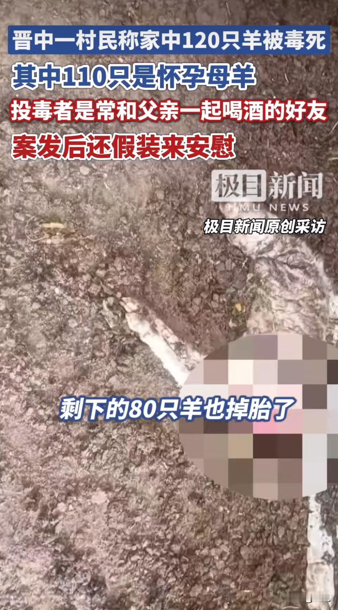 太让人愤怒了!山西晋中一个村民家,一夜之间120只羊被毒死,场面惨不忍睹。更可恨的是,下毒的不是别人,正是平时称兄道弟、常来家里喝酒的好朋友。事发后,这人还跑来假装帮忙,安慰受害者一家。 12月2号,好端端的羊群突然接二连三倒地死掉,一口气死了120只。这还没完,剩下80只活着的母羊,肚子里怀的崽也全都没保住,掉了胎。一大家子的指望,眼看就这么没了。 死的羊,那叫一个惨。里头有110只都是揣着崽的大肚子母羊,另外10只是专门配种用的公羊。这下手的人,分明是要断根,不让这家再有翻身的日子过。当时那场面,谁看了都得掉眼泪。 老赵家发现,死羊的地里不对劲。扒开草和叶子一看,底下是拌了毒药的玉米粒,这是被人故意藏在那儿的。明摆着是冲着他们家的羊来的。他们马上报了警。 警察来得快,破案更快。用了技术手段,第二天就锁定了下黑手的人。结果一出来,所有人都惊得说不出话:干这事的,竟然是同村的武某,是老赵平时一起喝酒、称兄道弟的好朋友。 这个武某,五十多岁了,经常来老赵家喝酒聊天。出事的当天,他居然还第一时间跑上门,假装热心地帮忙,安慰老赵两口子。嘴上说着“这是谁干的缺德事”,演得跟真的一样。现在想想,那副嘴脸真是让人心底发寒。 两家到底有什么深仇大恨?老赵的女儿想不通,难道就因为前阵子她爸和武某争执了几句?就这么点口角,值得对200只羊下这种毒手?这些羊是全家人的命。买羊的本钱,是老赵找亲戚朋友借的。家里还有孩子在读书,就等着卖羊的钱交学费、过日子。这一下,初步算算损失就接近39万,对一个农村家庭来说,天塌了也不过如此。 事后,武某的儿子一开始还上门,话说得挺漂亮,表示愿意赔偿,还说这事不是专门针对赵家。可这之后,态度就变了,再没提赔钱的事,到现在一分钱也没见到。老赵一家没办法,只能咬着牙走法律程序,盼着有个公正的结果。 现在武某已经被抓了,罪名是“危害公共安全罪”,检察院也已经批准逮捕了。可伤害已经造成,老赵一家看着空荡荡的羊圈,心里这口闷气,不知道什么时候才能咽下去。所谓的“好友”在酒桌上一团和气,背过身就能做出这种事,这不仅是毁了财产,更是把人心、把信任,都碾得粉碎。