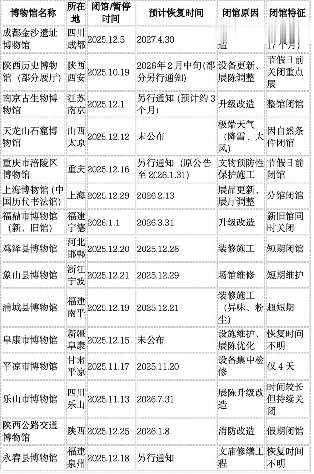 截至2025年12月25日,国内超过30家博物馆在近期发布公告信息称,因升级改造或其他原因,闭馆或暂停开放。
