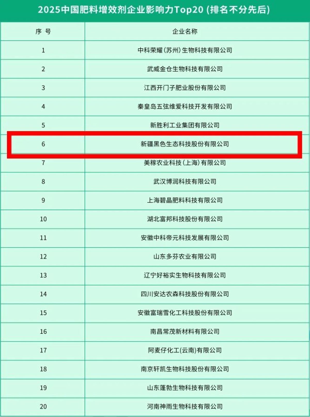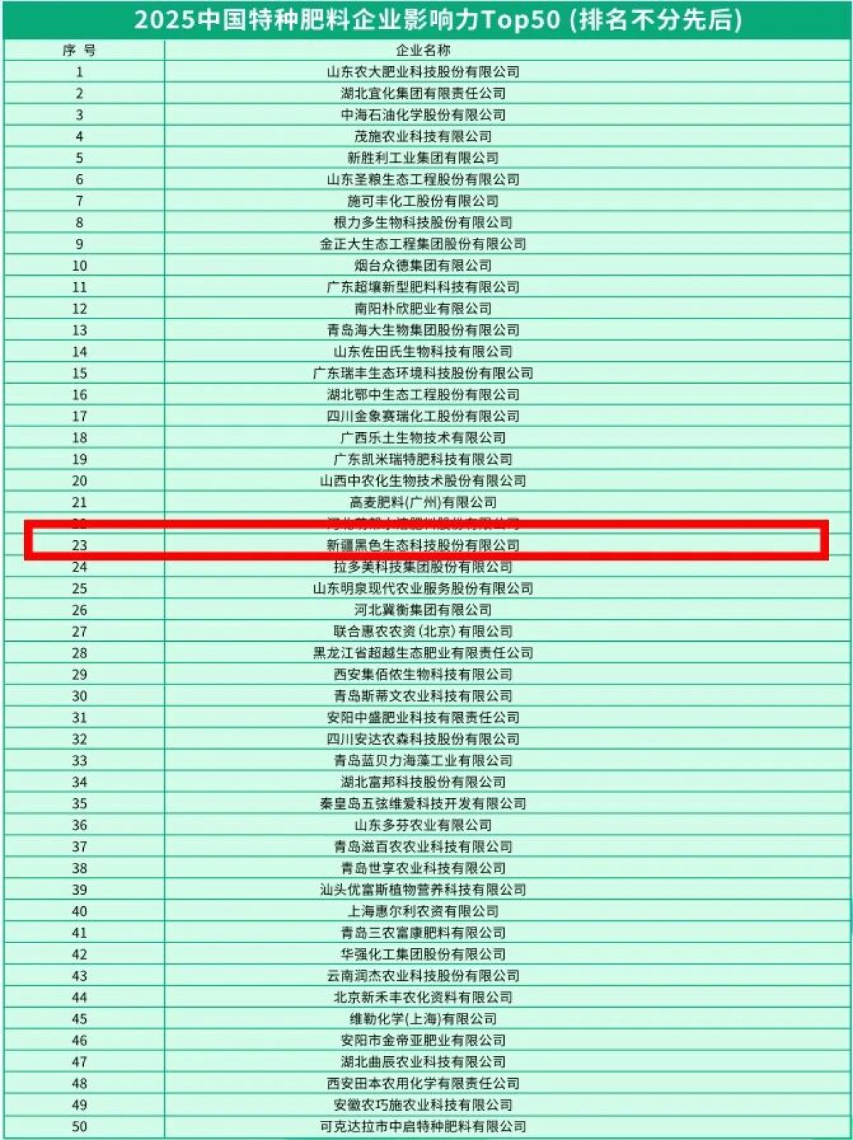 本次活动揭晓了2025年“中国化肥企业影响力100强”“中国特种肥料企业影响力50强”“中国肥料增效剂企业影响力20强”等荣誉,心连心集团荣登2025“中国化肥企业影响力100强”榜单,位居第4名。心连心集团子公司新疆黑色生态科技股份有限公司入选“中国特种肥料企业影响力50强”和“中国肥料增效剂企业影响力20强”榜单。