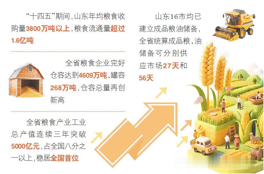 山东省政府新闻办今天(26日)举行新闻发布会,介绍“十四五”时期山东建设“齐鲁粮仓”新进展。山东省粮食和物资储备局党组书记、局长常绪扩表示,“十四五”期间,山东年均粮食收购量3800万吨以上,粮食流通量超过1.6亿吨。全省粮食企业完好仓容达到4609万吨、罐容268万吨,仓容总量再创新高。山东省粮食产业工业总产值连续三年突破5000亿元,占全国八分之一以上,稳居全国首位。