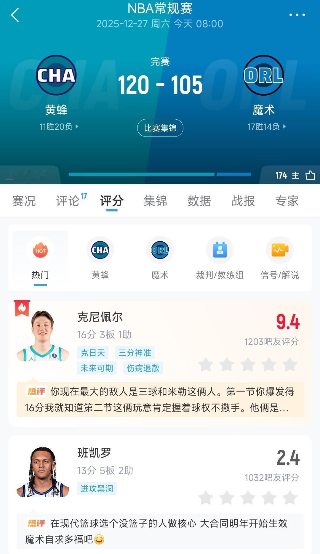 🐝蜂群逆袭!替补狂轰13分+三分雨浇灭魔术,新星崴脚离场引担忧!!北京时间12月27日,NBA常规赛上演惊天冷门!黄蜂客场以120-105力克东部黑马魔术,豪取两连胜!上半场两队陷入拉锯战,但黄蜂新秀克尼佩尔突然爆发,三分球4投全中独砍16分,率队建立9分优势;下半场塞克斯顿替补登场连中3记三分,分差瞬间拉开至20分!魔术末节反扑未果,最终缴械投降。黄蜂全民皆兵,7人得分上双!三球手感不佳仍贡献22+7+5,布里奇斯与米勒合砍31分,迪亚巴特10+13统治内线,替补席萨隆14+8、塞克斯顿13分。更恐怖的是全队三分球41投19中,外线火力直接打穿魔术防线!但惊喜中暗藏隐患:上半场结束前,克尼佩尔防守落地时踩到队友脚面,痛苦倒地后被搀扶离场,X光检查虽呈阴性,仍需返回夏洛特进一步评估。这位新秀上半场三分4中4弹无虚发,伤退前堪称黄蜂赢球头号功臣!魔术则彻底迷失:班凯罗13中4仅得13分,贝恩19中7+三分6中0,全队三分35投11中,外线效率被黄蜂碾压。唯一亮点是布莱克三分7中4砍下24分,却难挽败局。这场胜利让黄蜂球迷狂喜,但克尼佩尔的伤情又添一丝担忧。东部格局风云变幻,黄蜂能否延续黑马本色?魔术又该如何调整?