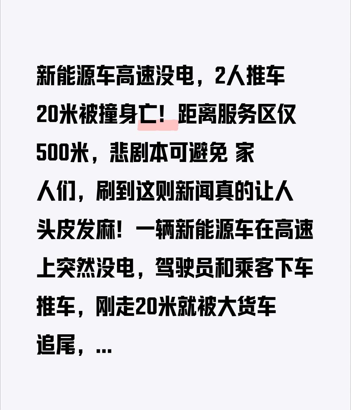 新能源车高速没电,2人推车20米被撞身亡!距离服务区仅500米,悲剧本可避免 家人们,刷到这则新闻真的让人头皮发麻!一辆新能源车在高速上突然没电,驾驶员和乘客下车推车,刚走20米就被大货车追尾,两人当场身亡。更让人扼腕的是,事发地距离最近的服务区只剩500米,而这场悲剧,本是一连串侥幸心理酿成的致命失误。 广东交警通报的细节,每一个都戳心。驾驶员林某出发前就知道车辆电量只够开80公里,乘客当场建议先充电再上高速,他不听;行驶途中先后经过两个服务区,乘客反复提醒补能,他还是抱着侥幸心理往前冲。直到车辆在慢车道彻底失电,他没做任何安全警示,反而拉着乘客直接下车推车,最终在凌晨的视线盲区里,被后方货车撞上,两条生命戛然而止。 可能有人会说“新能源车续航不靠谱”,但真正的杀手不是电量,而是错误的应急操作!根据交通法规,高速车辆故障后,正确做法就四步:车靠边、快警示、人撤离、即报警。应该先用惯性把车挪到应急车道,打开双闪,在车后150米处放三角警示牌,所有人立刻撤到护栏外,再拨打12122高速救援电话,很多地区15公里内拖车还免费。可林某偏偏选了最危险的方式,把慢车道当成了停车场,把自己和乘客置于致命风险中。 更值得警惕的是,冬季新能源车续航会“打折”,高速行驶、开空调都会加速耗电,这是很多车主容易忽视的点 。杭州就曾发生过新能源货车因低温续航腰斩,在高速弯道趴窝的险情,幸好交警及时救援才没出大事 。其实只要记住“电量低于30%就找服务区”,提前规划充电站点,就能避免半路失电;就算真的没电,也绝不能在行车道推车、逗留,这不是省钱,是拿命赌。 两条生命的逝去,给所有新能源车车主敲响了警钟:续航焦虑不可怕,安全意识缺失才致命。不管开燃油车还是新能源车,上高速前查车况、规划路线,遇到故障守规则,都是对自己和他人的负责。 希望这样的悲剧再也不要发生,也愿每个司机都能把“安全第一”刻在心里。你开新能源车跑过高速吗?