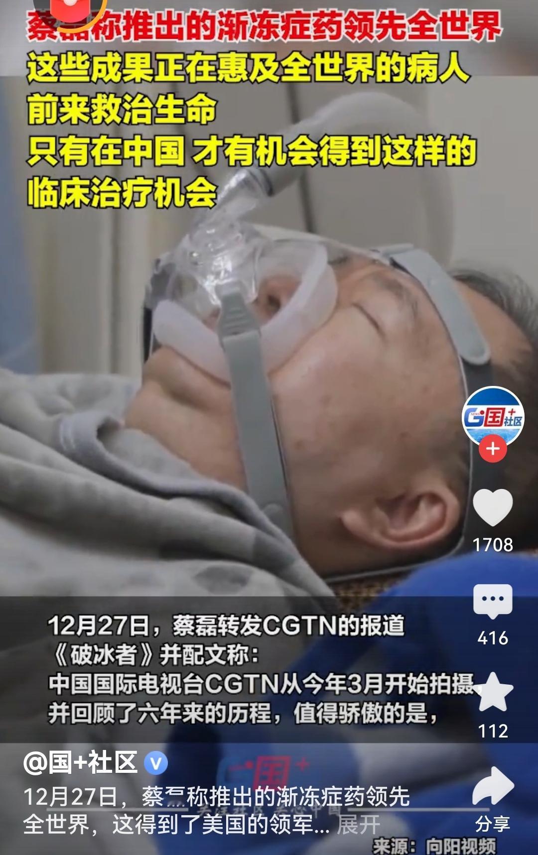 蔡磊称推出的渐冻症药领先全世界蔡磊以自身为炬,与科学家并肩攻克渐冻症难题,这份直面病魔的勇气和推动科研的执着太动人!中国研发的药物领跑世界,为全球患者带来了新希望![赞][赞][赞] 蔡磊寄语年轻人 评论打卡任务