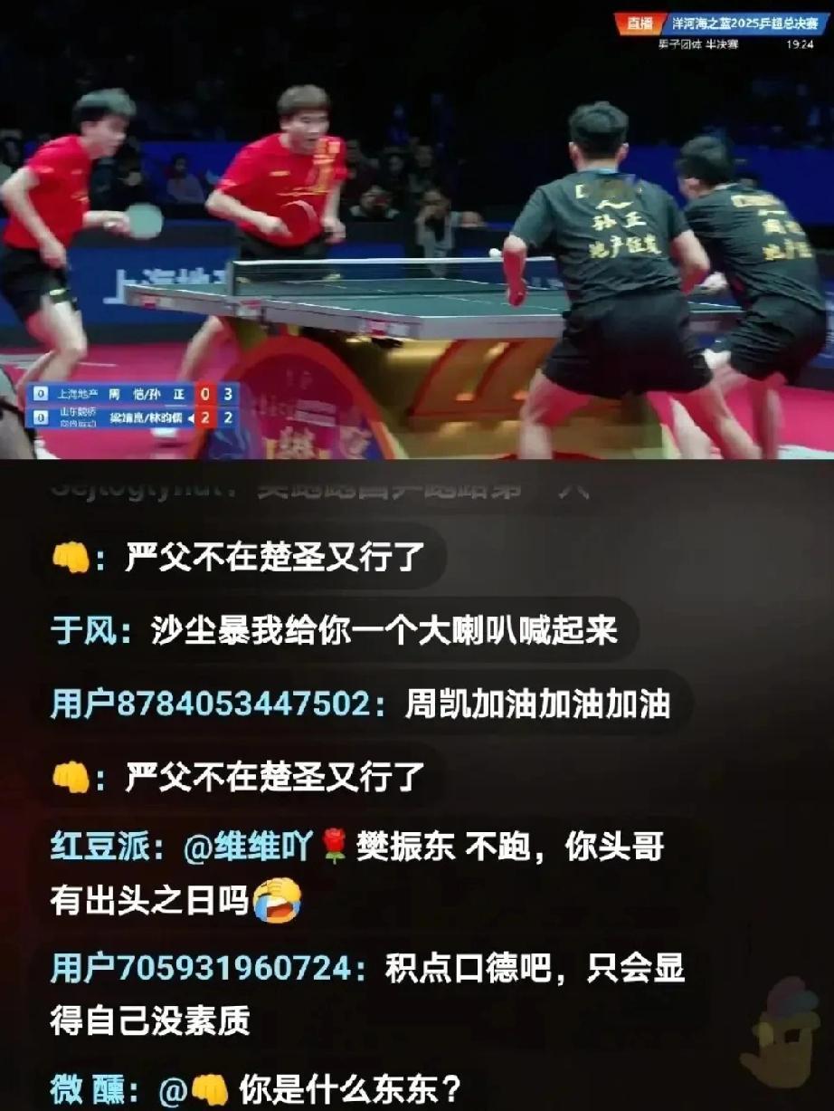 说实话,今年的乒超总决赛,看的不是滋味。 12月27晚,南京乒超总决赛半决赛,伤愈复出的王楚钦,率领山东队兵不血刃,以3比0战胜上海队,昂首闯入今晚的决赛。 王楚钦,比赛前在犹豫了很久,为了不留遗憾,权衡下来,他决定报名参赛。 第二场男单,王楚钦状态不错,在发接发、前三板、中远台对拉中,全面占据上风,以3-0战胜了实力不弱的赵子豪,为球队胜利拿下关键一分。 然而,没想到的是,整场比赛,气氛并不友好,很多弹幕霸屏都在指责他。 给人的感觉,真是上场不行,不上场也不行。 还是走自己的路,让别人去说吧,这恰恰说明,你比别人优秀。 因为喜欢周雨的解说,进了直播间看球,但很多弹幕,简直让人无语,真是服了,好好看个比赛,就那么难吗?