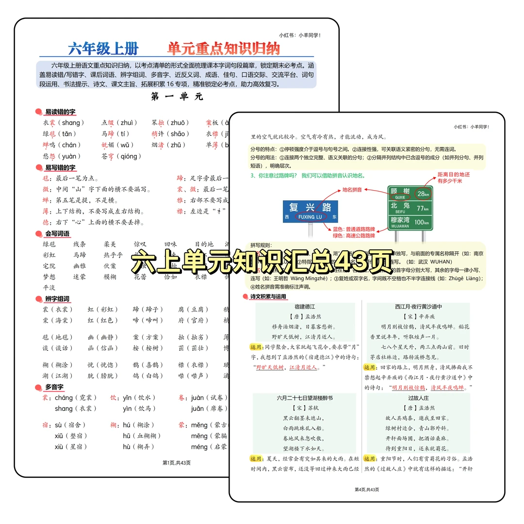 ✅43页知识汇总,精准覆盖 16 大核心专项:易读错 / 写错字、课后词语、辨字组词、多音字、近反义词、成语积累、佳句盘点,还有口语交际、交流平台、词句段运用等高频考点,逐单元梳理核心,直接锁定期末必考知识点,复习效率翻倍! 📌纯原创手工整理,拒绝冗余内容,每一页都是重点精华 ⚠️版权声明:原创整理不易,严禁转载、网络发布及商用,侵权必究 六年级宝子期末冲刺直接冲,戳左下角店铺获取完整版!这份在手,复习不用慌~
