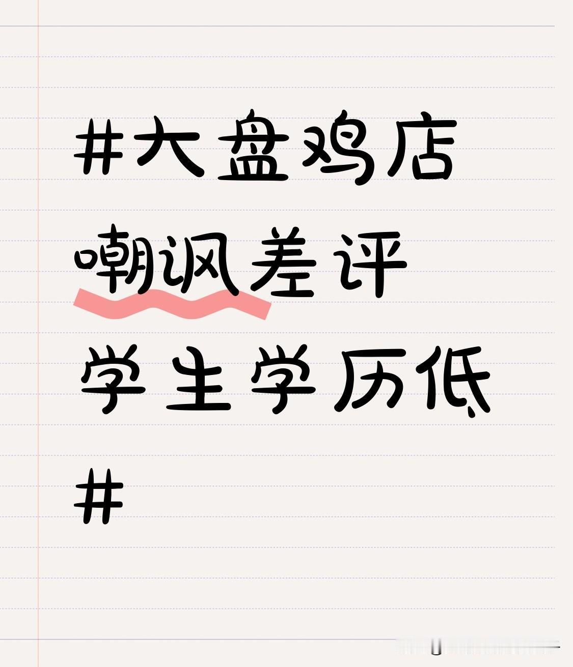 大盘鸡店嘲讽差评学生学历低 甘肃兰州这大盘鸡店可真是“作妖”到极致了!有高校学生给差评,反映出餐慢、分量不足等问题很正常,可这商家倒好,直接嘲讽学生学历低,还恶意揣测毕业后只能送外卖、进电子厂。 职业本就没有高低贵贱之分,这商家公然歧视,严重伤害学生感情。事件发酵后,大量学生抵制。品牌总部要求涉事商家道歉,还被拒绝。总部只能与其解约,责令摘牌。截至12月28日,涉事门店停业。这商家也太没格局,做生意得有服务意识,不然迟早凉凉。