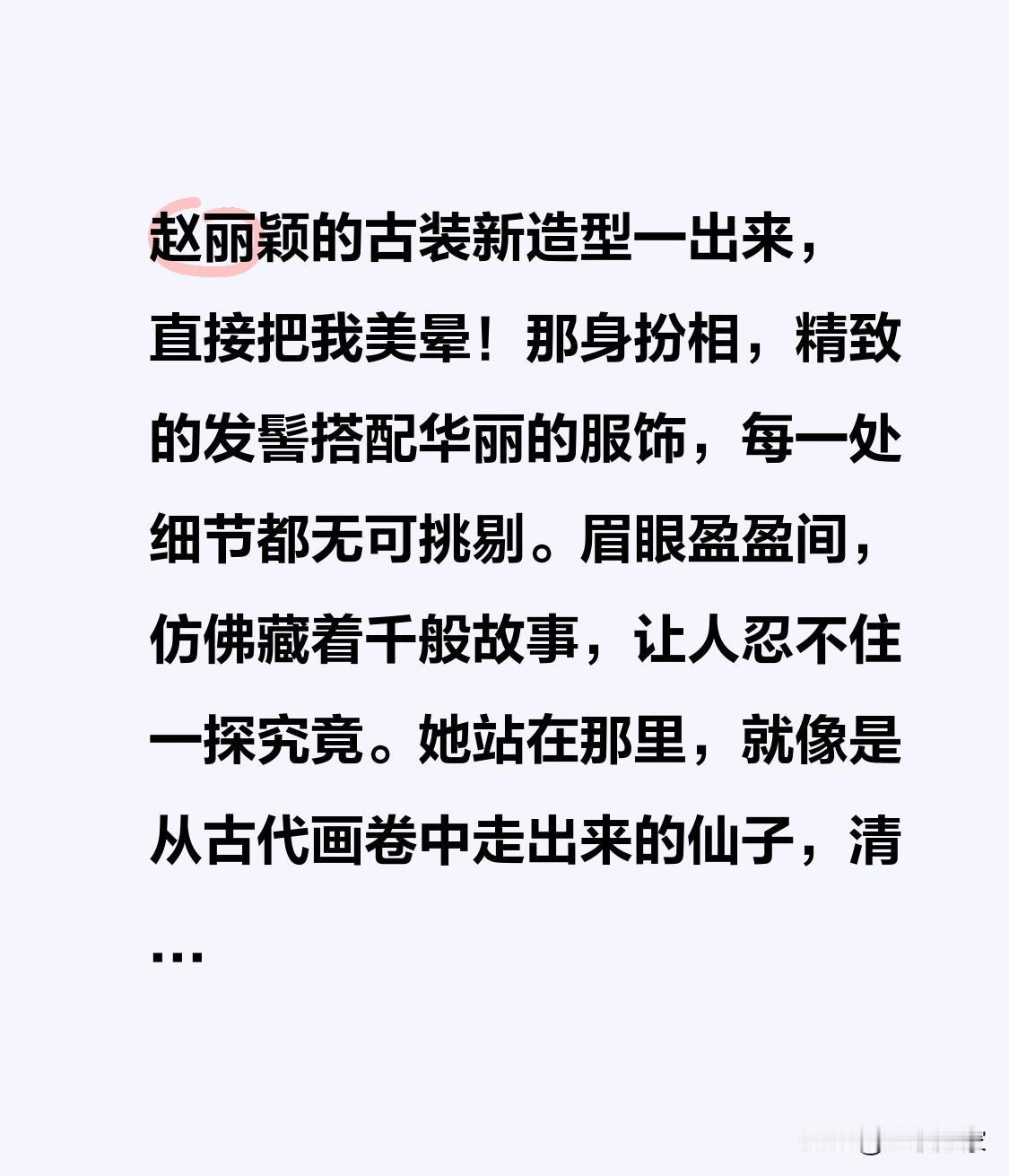 赵丽颖的古装新造型一出来,直接把我美晕!那身扮相,精致的发髻搭配华丽的服饰,每一处细节都无可挑剔。眉眼盈盈间,仿佛藏着千般故事,让人忍不住一探究竟。 她站在那里,就像是从古代画卷中走出来的仙子,清冷又动人。想象着她在剧中凭借这造型大杀四方,估计又能掀起一波追剧热潮。 这造型究竟能让她在剧中演绎出怎样的精彩故事?会不会成为她古装剧的又一经典形象?新造型又会和剧中人物碰撞出怎样的火花?实在太让人期待啦,你们怎么看她这个古装新造型呢? 赵丽颖 赵丽颖 赵丽颖造型 赵丽颖演技蜕变 赵丽颖写真照 赵丽颖 赵丽颖 赵丽颖造型 赵丽颖演技蜕变 赵丽颖写真照 赵丽颖 赵丽颖 赵丽颖韩国生图