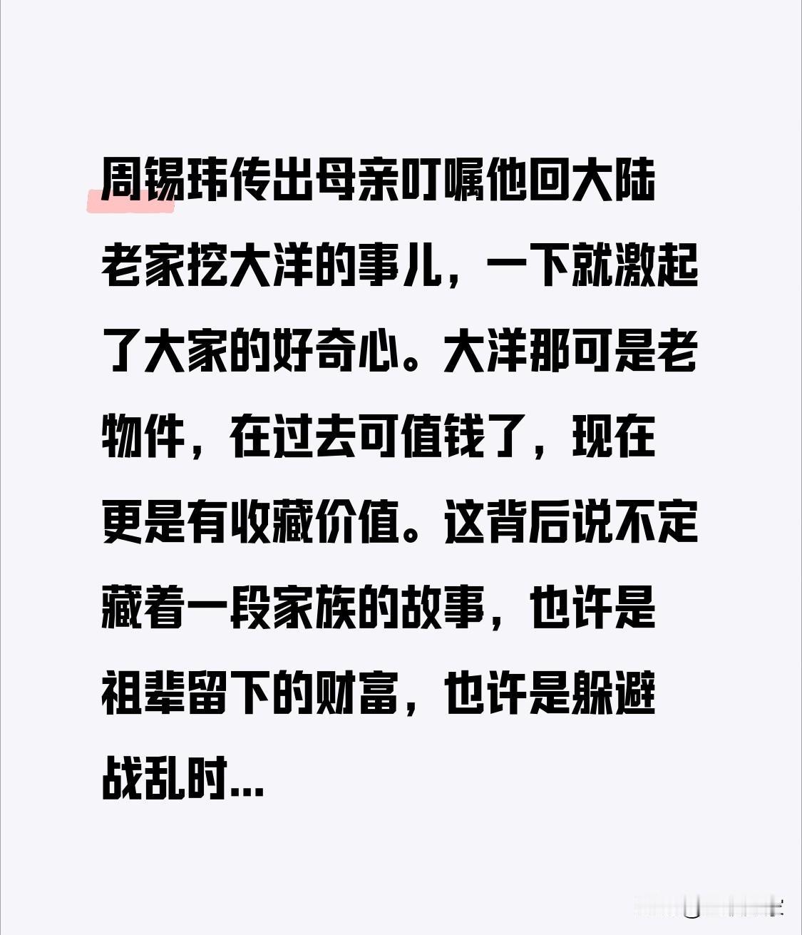 周锡玮传出母亲叮嘱他回大陆老家挖大洋的事儿,一下就激起了大家的好奇心。大洋那可是