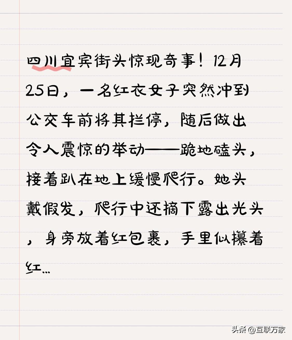 四川宜宾街头惊现奇事!12月25日,一名红衣女子突然冲到公交车前将其拦停,随后做出令人震惊的举动——跪地磕头,接着趴在地上缓慢爬行。她头戴假发,爬行中还摘下露出光头,身旁放着红包裹,手里似攥着红色卡纸。这场景让公交车被迫停下,后方车排起长队,路人纷纷驻足拍摄。大家众说纷纭,有人心疼疑惑,有人担忧安全,还有人提醒不能影响公共秩序。 此前郑州也曾有女子引导男子跪地爬行,最后查明是为寻求刺激,两人还被拘了。那宜宾这女子为啥这么做?是受委屈了,还是另有隐情?宜宾当地派出所已安排核实,社区和街道暂未明确回应。这背后到底藏着啥秘密?大家觉得女子这么做的原因是什么?这种行为该不该受到处罚?后续又会怎样发展? 马路惊现女子 宜宾跳舞美女 宜宾观音 宜宾大妈 泸州醉酒女 宜宾纵火事件 红衣乞讨女孩 宜宾伤人事件 宜宾老人 宜宾透水 宜宾伤人事件