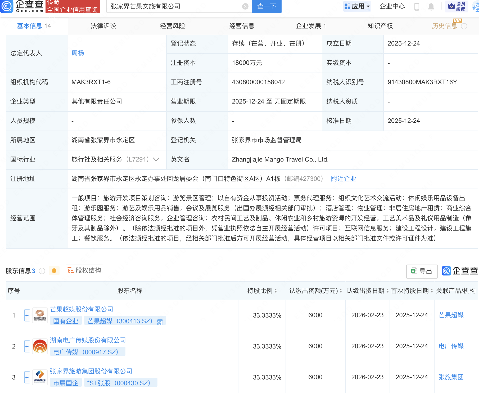 企查查APP显示,近日,张家界芒果文旅有限公司成立,注册资本1.8亿元,经营范围包含:互联网信息服务;建设工程设计;建设工程施工;餐饮服务等。企查查股权穿透显示,该公司由芒果超媒(300413)、电广传媒(000917)、*ST张股(000430)共同持股。