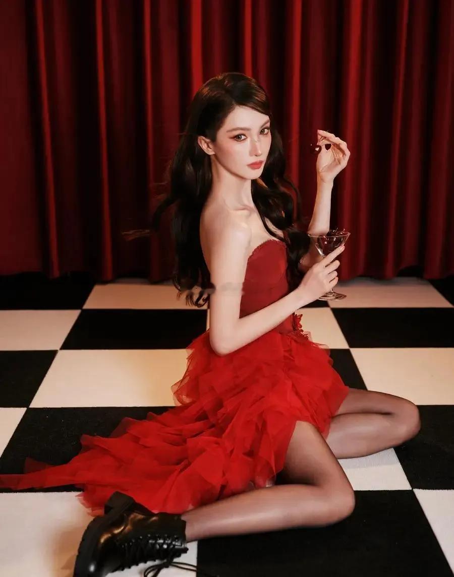 金晨换风格太绝了!一袭红色抹胸纱裙像团燃烧的火,搭黑丝又神秘又魅惑,两种风格撞出