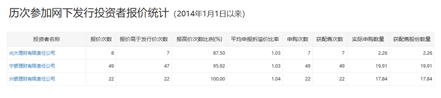 据深交所官网披露信息,光大理财、宁银理财、兴银理财均参与深交所上市公司的网下打新,合计报价79次,报价高于发行价次数76次,或配售39.97万股。详情如下: