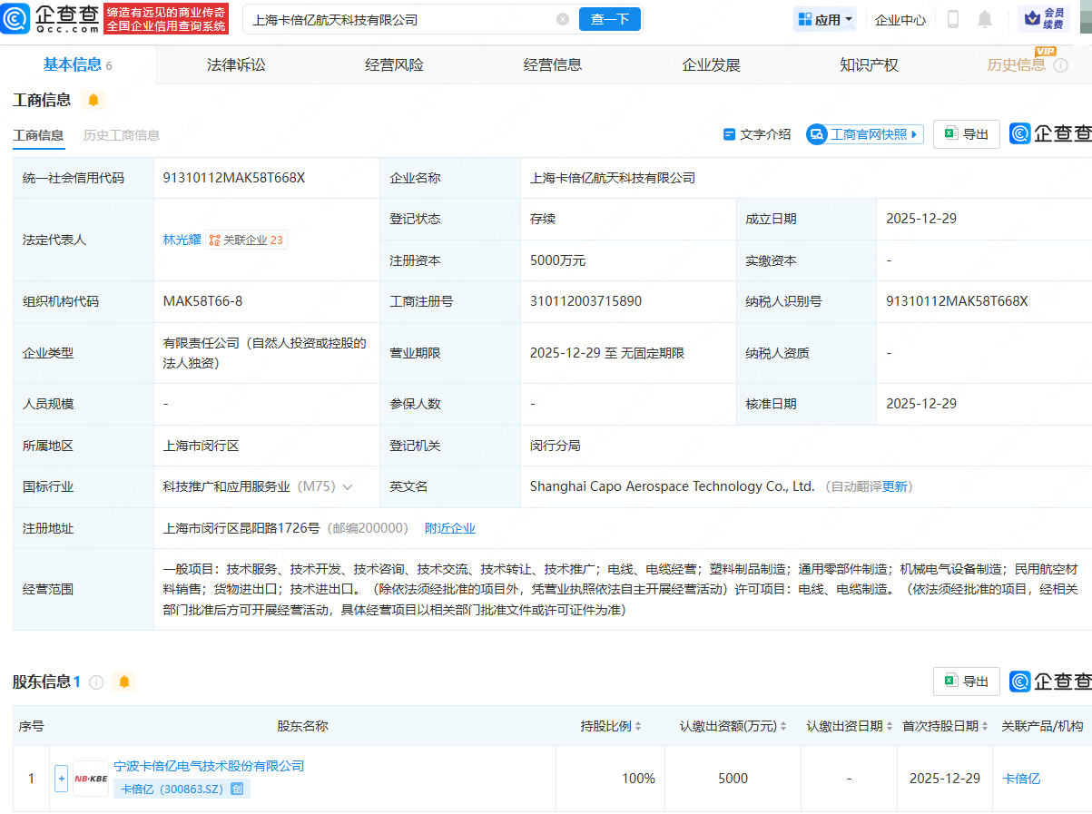 企查查APP显示,近日,上海卡倍亿航天科技有限公司成立,法定代表人为林光耀,注册资本为5000万元,经营范围包含:电线、电缆经营;塑料制品制造;通用零部件制造;机械电气设备制造;民用航空材料销售等。企查查股权穿透显示,该公司由卡倍亿(300863)全资持股。