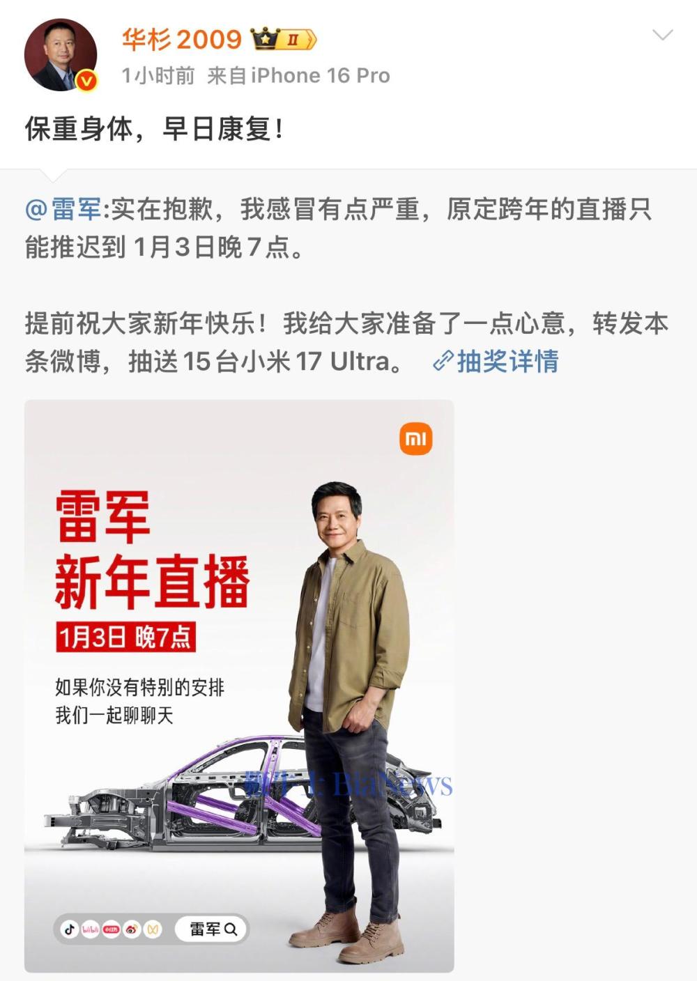 今日,小米科技创始人雷军在网络社交平台表示,因为感冒有点严重,原定跨年的直播推迟到1月3日晚7点。