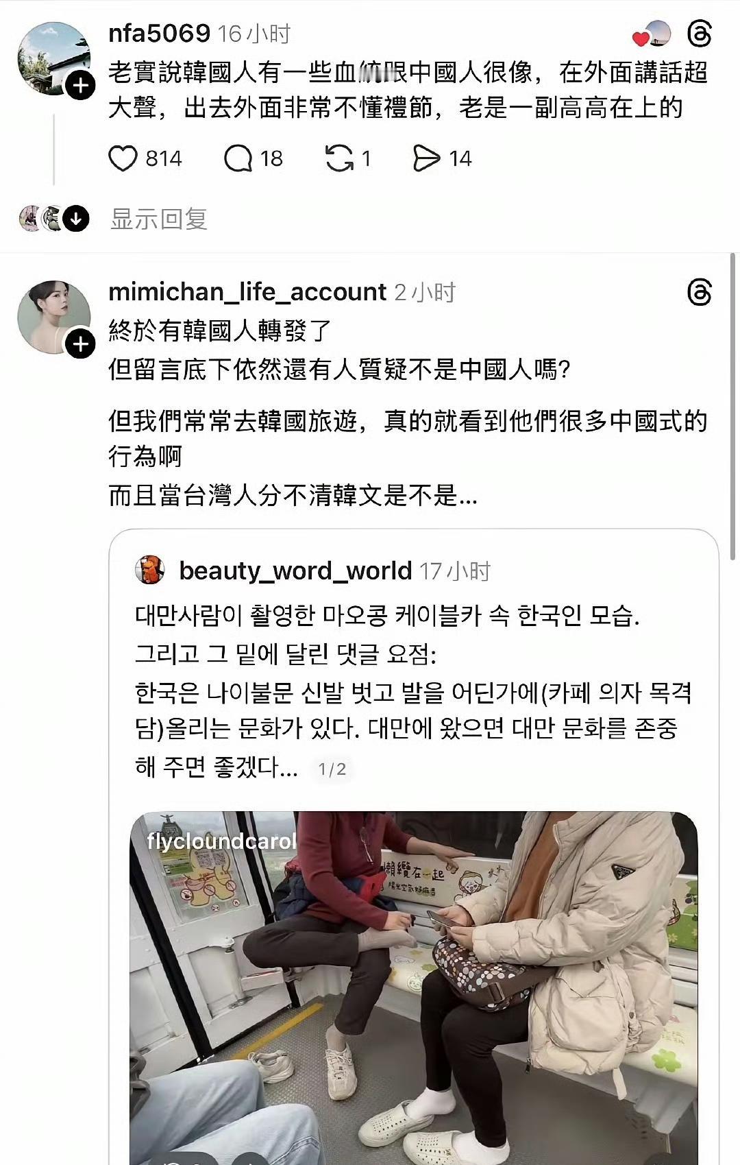 湾湾:韩国人有一些血统跟中国人很像、 在缆车上,一个韩国女子突然脱掉鞋抠脚,还要求车上的人让开,她要拍照 不管哪国人,低素质的人行为举止都一个样,西方国家的人这种行为还少吗?而且韩国人就是非常吵,可能泡菜吃太多了说话还到处喷口水