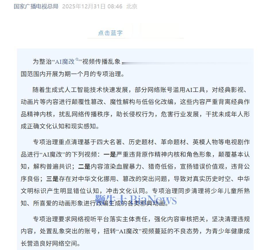 12月31日消息,国家广播电视总局发文称,为整治“AI魔改”视频传播乱象,国家广播电视总局自2026年1月1日起,在全国范围内开展为期一个月的专项治理。