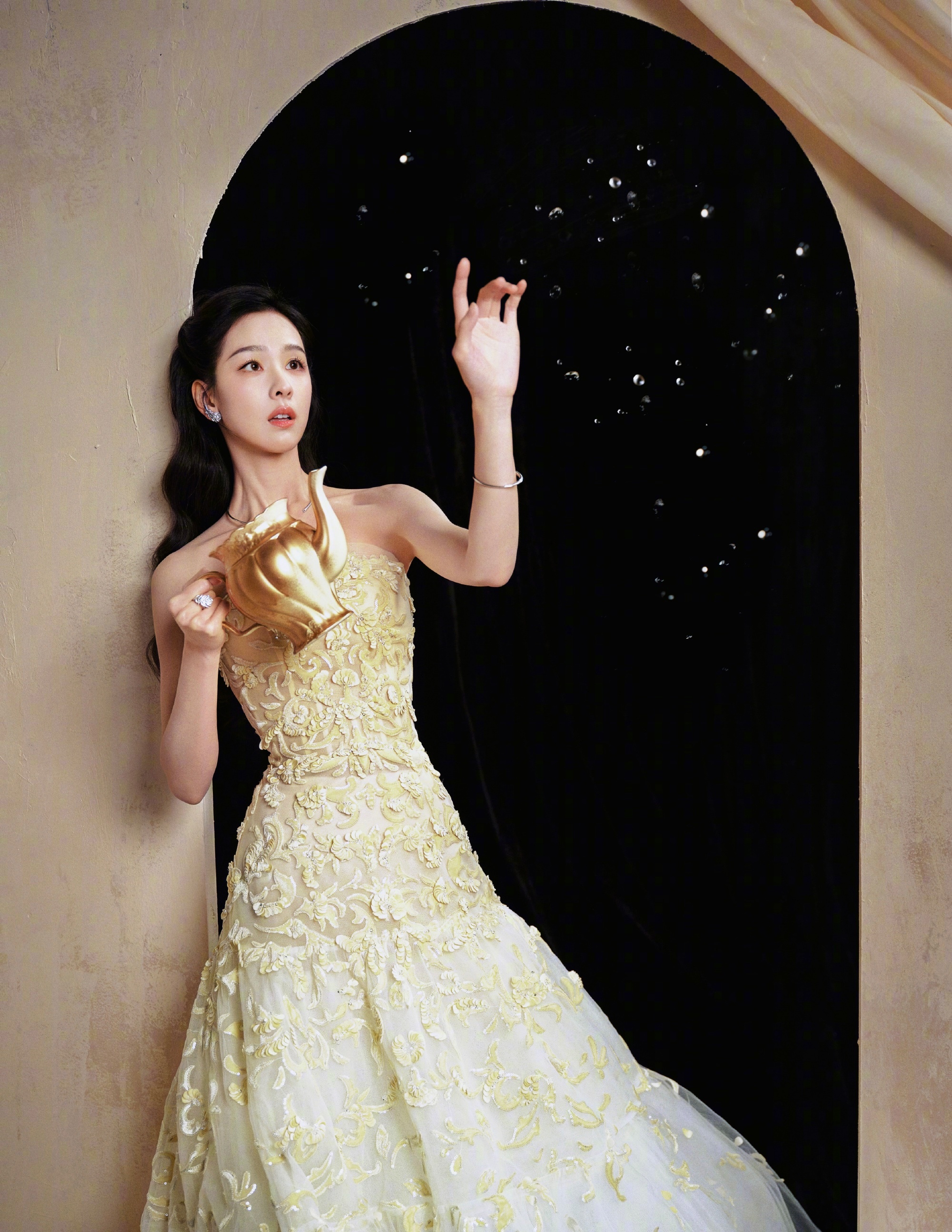 陈都灵 今日 晚会造型,淡黄亮片刺绣礼裙搭配Boucheron钻石羽毛珠宝,优雅明媚的复古美人。💛✨