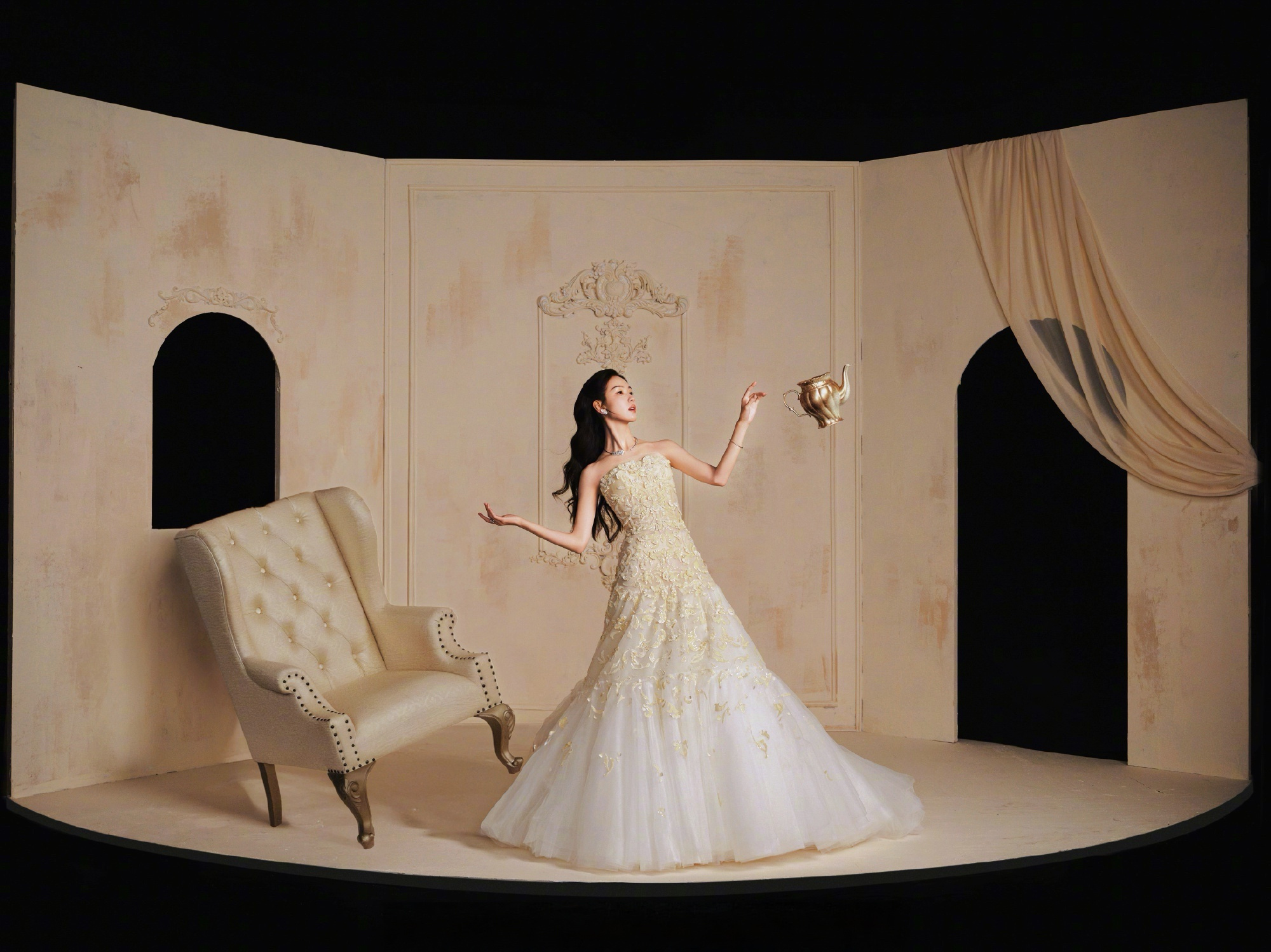 陈都灵 今日 晚会造型,淡黄亮片刺绣礼裙搭配Boucheron钻石羽毛珠宝,优