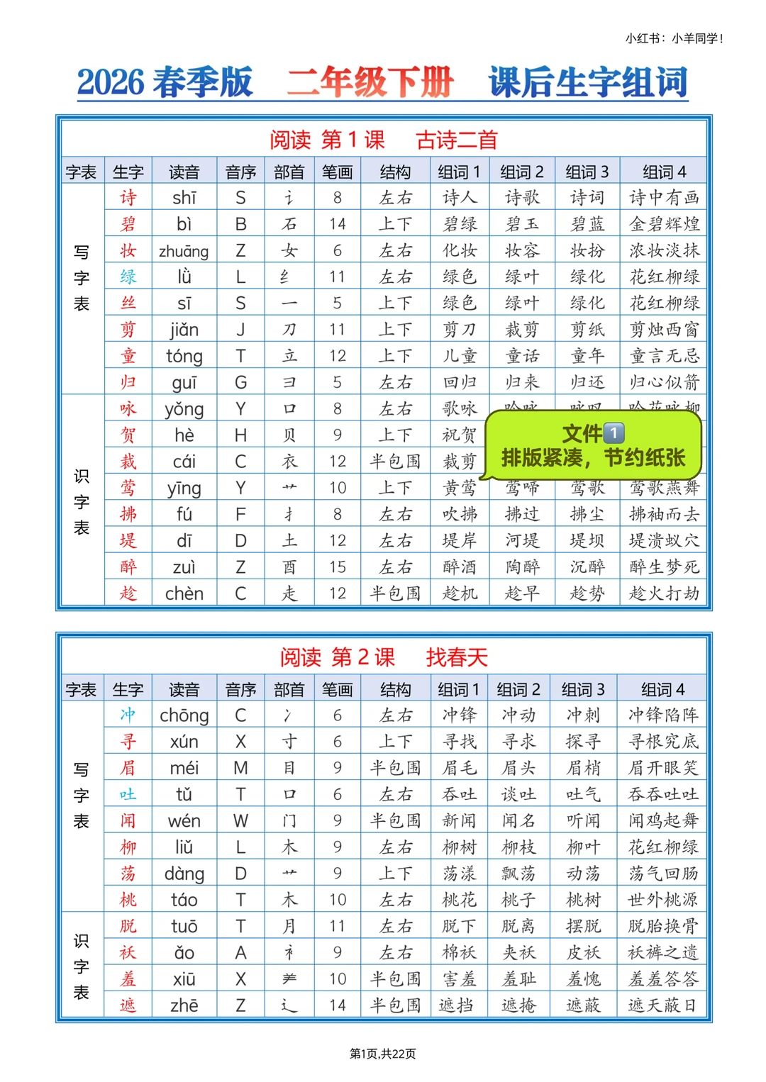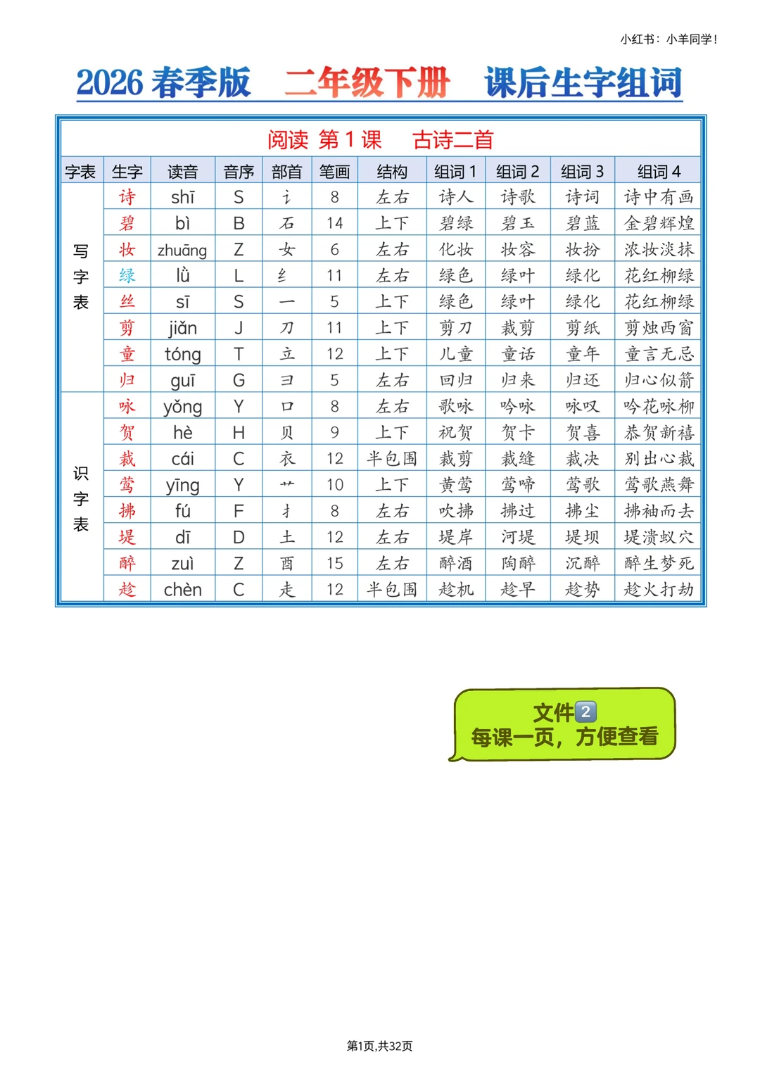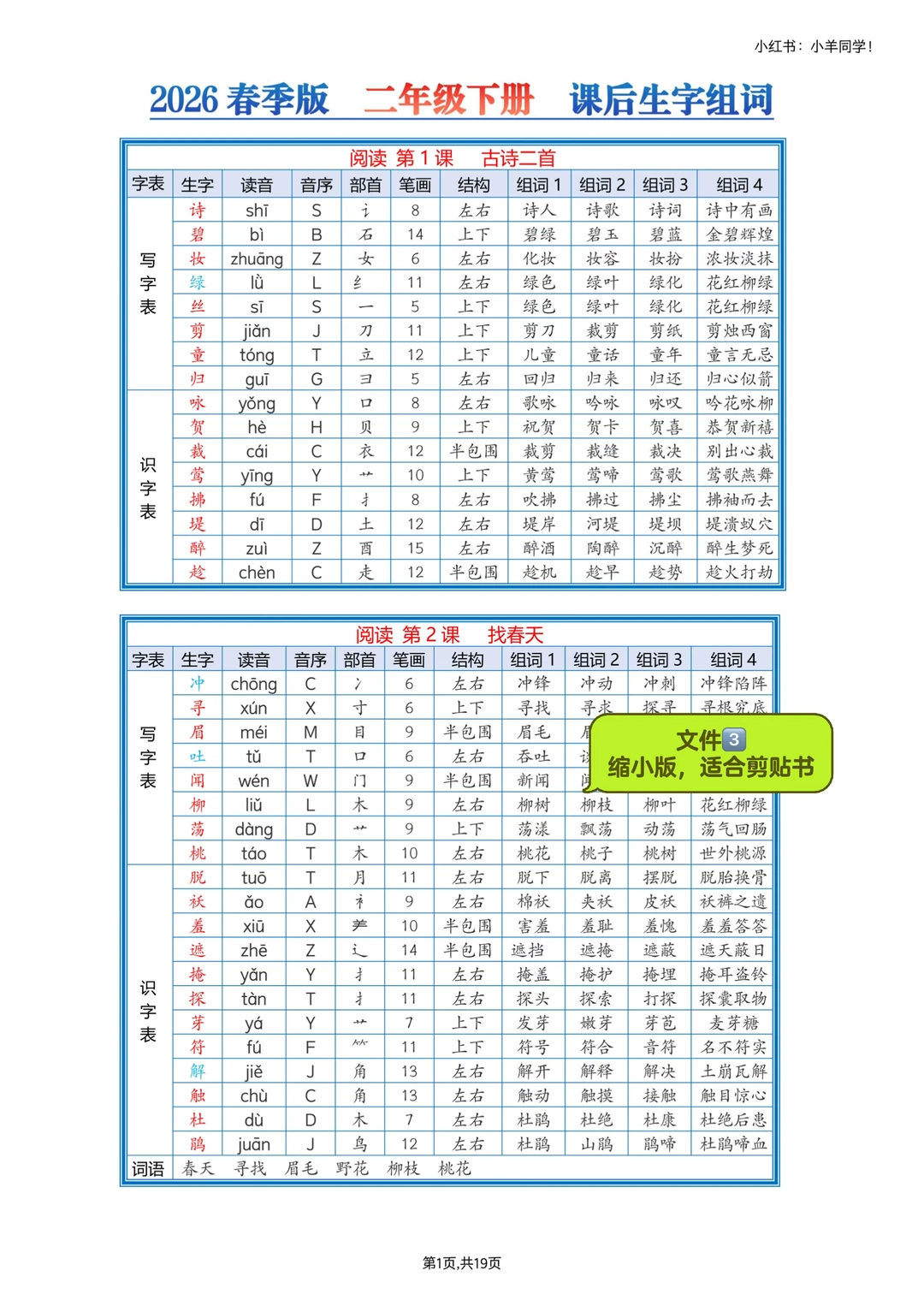 剪下来贴课本,随时看,记生字组词超方便