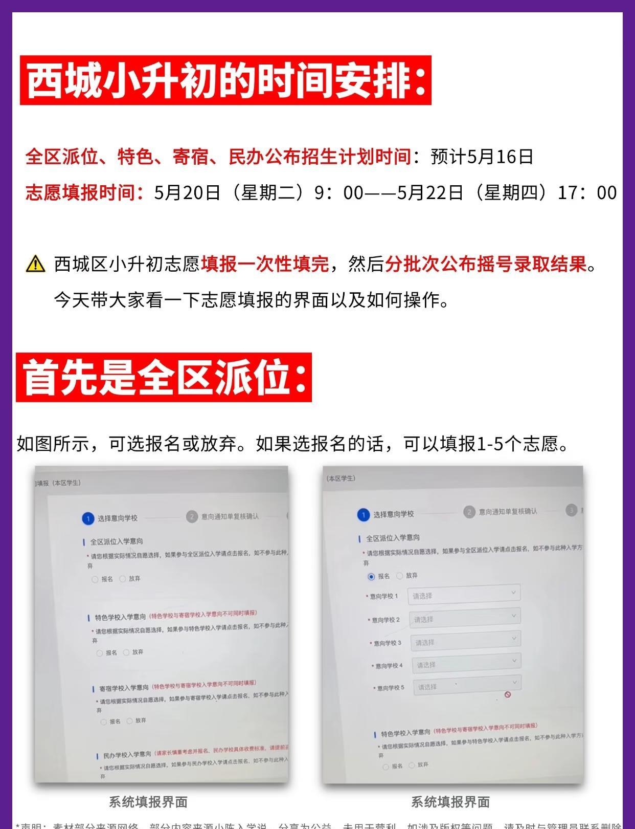 西城小升初,志愿填报界面长这样! 🙋♀️所有西城小六家长集合!! ➡️西城小升初志愿是一次性填报,分批录取的,且仅有三天时间!! ❗❗小升初网报界面到底长啥样?怎么填报??给大家整理好了! 💥填报雷区预警: 💣全区派位可填1-5所,但别硬凑数! 💣特色校和寄宿校只能二选一 💣学区登记不想填可放弃 💣学区派位必须填满10所且不重复! 🔍独家填报策略: ✨全区派位可以填0-5所学校,不想去的学校一定不要填 ✨特色校需要官网确认 ✨学区派位根据自己情况按梯度填 西城小升初 西城小升初全区 西城小升初全区派位 西城妈妈 西城鸡娃圈 西城小升初派位 北京小升初 志愿填报 升学规划