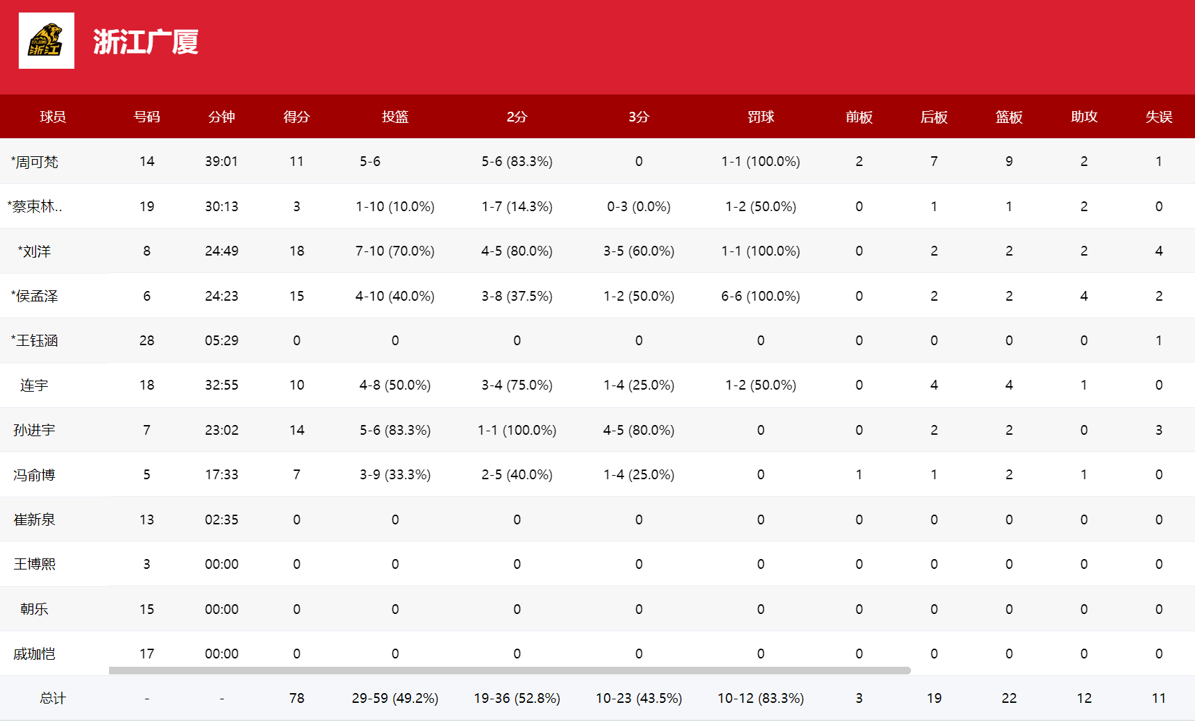 广厦:刘洋18分、侯孟泽15分、孙进宇14分